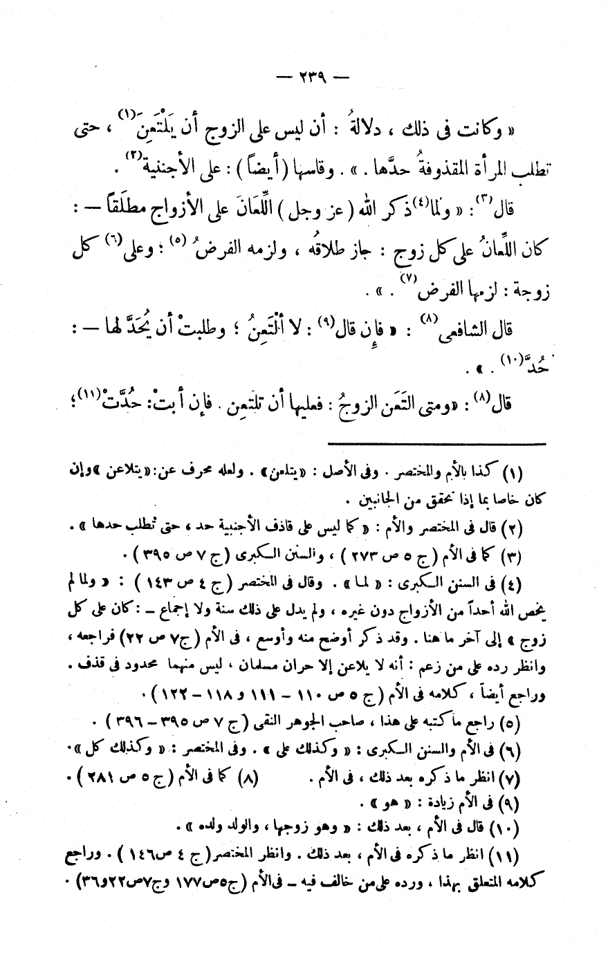 (4) فى السّنَن الْكُبْرَى: «لما» . وَقَالَ فى الْمُخْتَصر (ج 4 ص 143) : «وَلما لم يخص الله أحدا من الْأزْوَاج دون غَيره، وَلم يدل على ذَلِك سنة وَلَا إِجْمَاع-: كَانَ على كل زوج» إِلَى آخر مَا هُنَا. وَقد ذكر أوضح مِنْهُ وأوسع، فى الْأُم (ج 7 ص 22) فَرَاجعه، وَانْظُر رده على من زعم: أَنه لَا يُلَاعن إِلَّا حران مسلمان، لَيْسَ مِنْهُمَا مَحْدُود فى قذف.