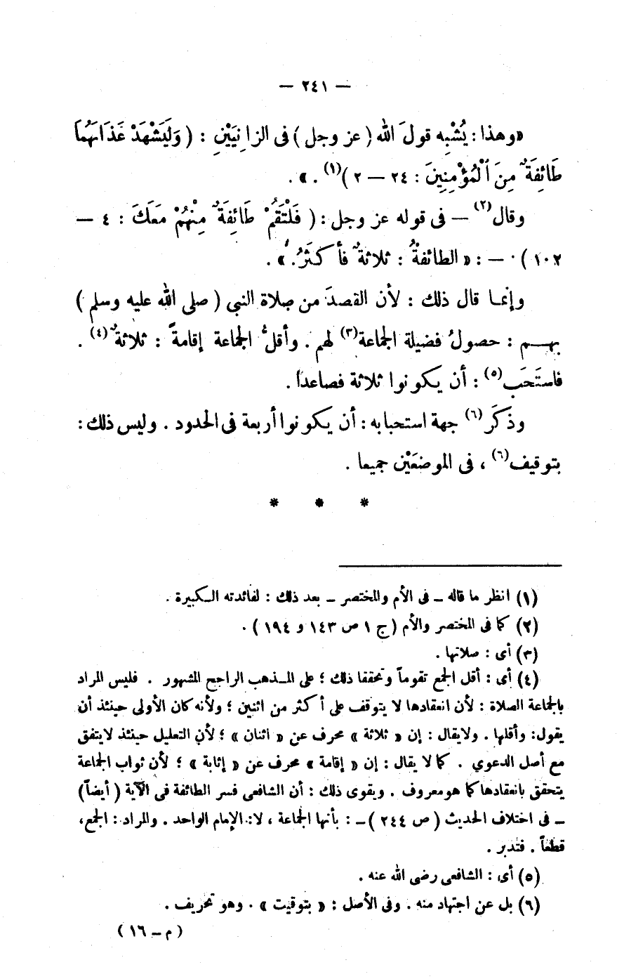 (4) أَي: أقل الْجمع تقوما وتحققا ذَلِك على الْمَذْهَب الرَّاجِح الْمَشْهُور. فَلَيْسَ المُرَاد بِالْجَمَاعَة الصَّلَاة: لِأَن انْعِقَادهَا لَا يتَوَقَّف على أَكثر من اثْنَيْنِ وَلِأَنَّهُ كَانَ الأولى حِينَئِذٍ أَن يَقُول: وأقلها. وَلَا يُقَال: إِن «ثَلَاثَة» محرف عَن «اثْنَان» لِأَن التَّعْلِيل حِينَئِذٍ لَا يتَّفق مَعَ أصل الدعوي. كَمَا لَا يُقَال: إِن «إِقَامَة» محرف عَن «إثابة» لِأَن ثَوَاب الْجَمَاعَة يتَحَقَّق بانعقادها كَمَا هُوَ مَعْرُوف. ويقوى ذَلِك: أَن الشَّافِعِي فسر الطَّائِفَة فى الْآيَة (أَيْضا) - فى اخْتِلَاف الحَدِيث (ص 244) -: بِأَنَّهَا الْجَمَاعَة، لَا: الإِمَام الْوَاحِد. وَالْمرَاد: الْجمع، قطعا. فَتدبر.