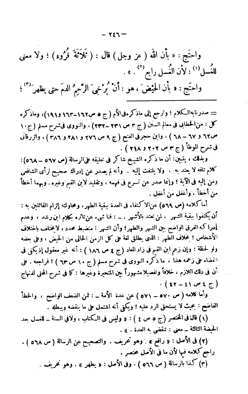 (1) قَالَ فى الْمُخْتَصر (ج 5 ص 4) : «وَلَيْسَ فى الْكتاب، وَلَا فِي السّنة- للْغسْل بعد الْحَيْضَة الثَّالِثَة- معنى: تنقضى بِهِ الْعدة.» .