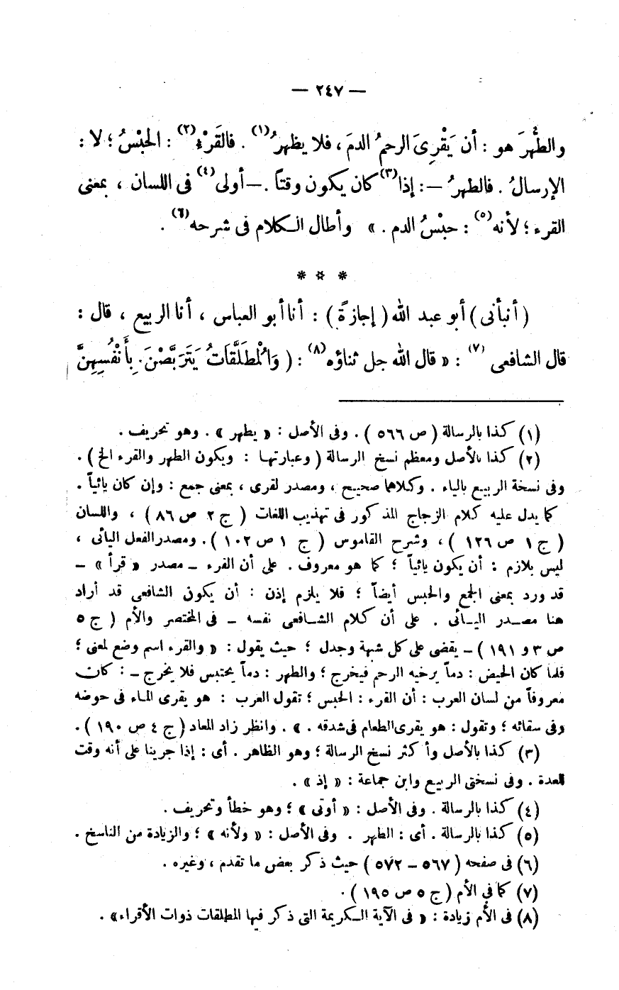 كَمَا يدل عَلَيْهِ كَلَام الزّجاج الْمَذْكُور فى تَهْذِيب اللُّغَات (ج 2 ص 86) ، وَاللِّسَان (ج 1 ص 126) ، وَشرح الْقَامُوس (ج 1 ص 102) . ومصدر الْفِعْل اليائى، لَيْسَ بِلَازِم: أَن يكون يائيا كَمَا هُوَ مَعْرُوف. على أَن الْقُرْء- مصدر «قَرَأَ» - قد ورد بِمَعْنى الْجمع وَالْحَبْس أَيْضا فَلَا يلْزم إِذن: أَن يكون الشَّافِعِي قد أَرَادَ هُنَا مصدر اليائى. على أَن كَلَام الشَّافِعِي نَفسه- فى الْمُخْتَصر وَالأُم (ج 5 ص 3 و191) - يقْضى على كل شُبْهَة وجدل حَيْثُ يَقُول: «والقرء اسْم وضع لِمَعْنى فَلَمَّا كَانَ الْحيض: دَمًا يرخيه الرَّحِم فَيخرج وَالطُّهْر: دَمًا يحتبس فَلَا يخرج-: كَانَ مَعْرُوفا من لِسَان الْعَرَب: أَن الْقُرْء: الْحَبْس تَقول الْعَرَب: هُوَ يقرى المَاء فى حَوْضه وفى سقائه وَتقول: هُوَ يقرى الطَّعَام فى شدقه.» . وَانْظُر زَاد الْمعَاد (ج 4 ص 190) .