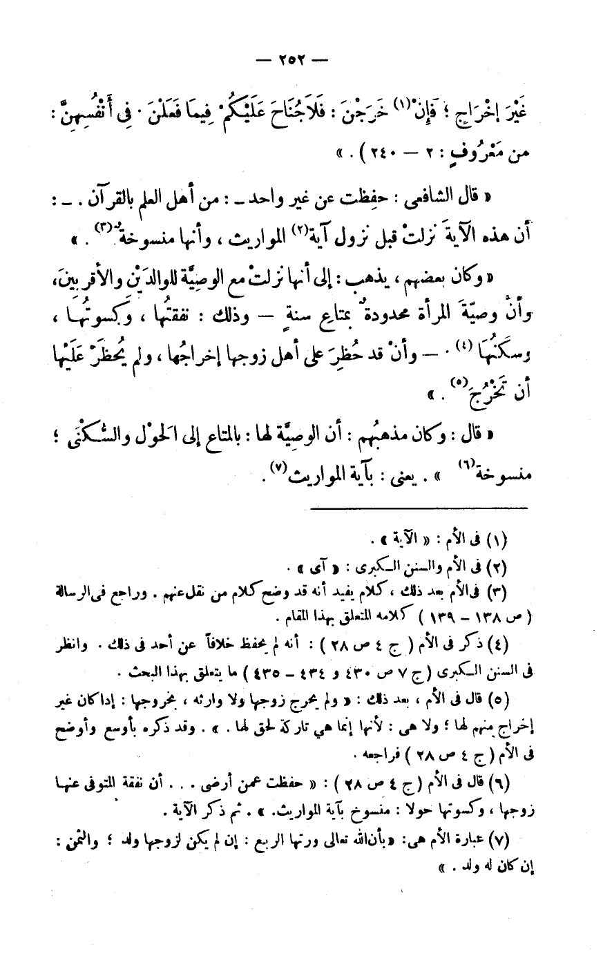 (6) قَالَ فى الْأُم (ج 4 ص 28) : «حفظت عَمَّن أرْضى ... أَن نَفَقَة الْمُتَوفَّى عَنْهَا زَوجهَا، وكسوتها حولا: مَنْسُوخ بِآيَة الْمَوَارِيث.» . ثمَّ ذكر الْآيَة.