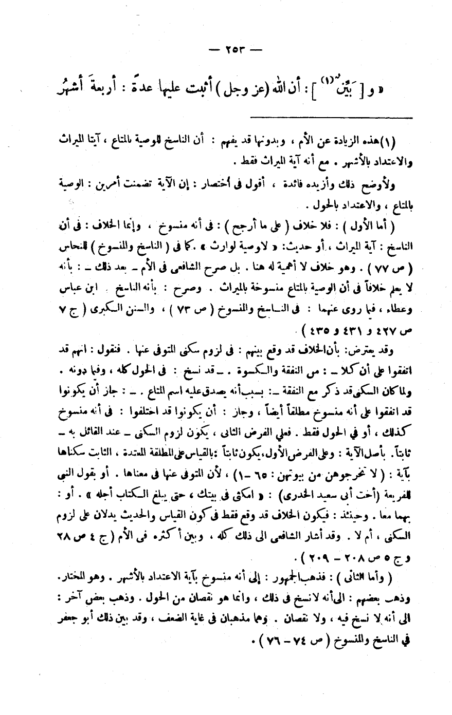 (1) هَذِه الزِّيَادَة عَن الْأُم، وبدونها قد يفهم: أَن النَّاسِخ للْوَصِيَّة بالمتاع، آيتا الْمِيرَاث والاعتداد بِالْأَشْهرِ. مَعَ أَنه آيَة الْمِيرَاث فَقَط.