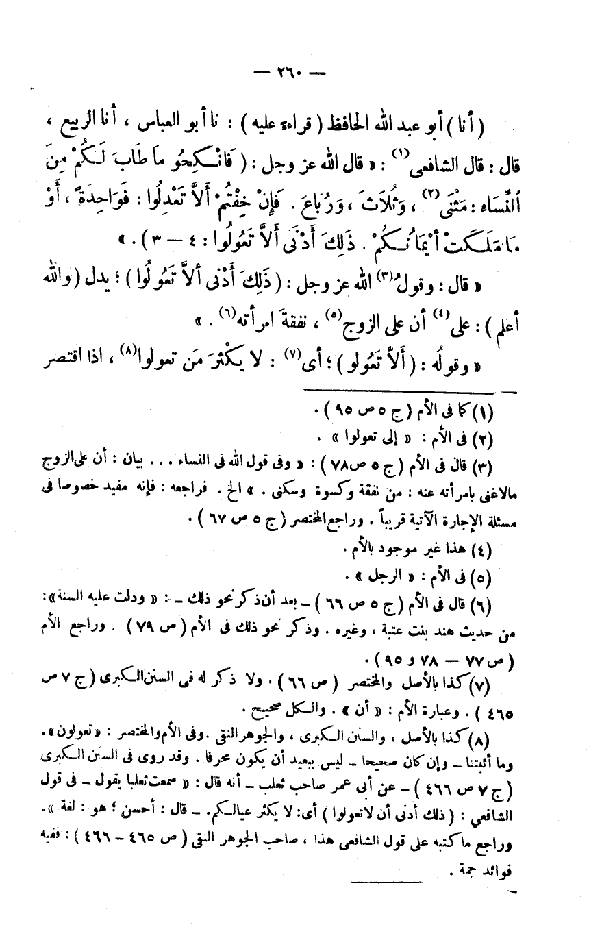 (أَنَا) أَبُو عَبْدِ الله الْحَافِظ (قراءء عَلَيْهِ) : نَا أَبُو الْعَبَّاسِ، أَنَا الرَّبِيعُ، قَالَ: قَالَ الشَّافِعِيُّ «1» : «قَالَ اللَّهُ عَزَّ وَجَلَّ: (فَانْكِحُوا مَا طابَ لَكُمْ مِنَ النِّساءِ: مَثْنى «2» ، وَثُلاثَ، وَرُباعَ. فَإِنْ خِفْتُمْ أَلَّا تَعْدِلُوا: فَواحِدَةً، أَوْ مَا مَلَكَتْ أَيْمانُكُمْ. ذلِكَ أَدْنى أَلَّا تَعُولُوا: 4- 3) .»