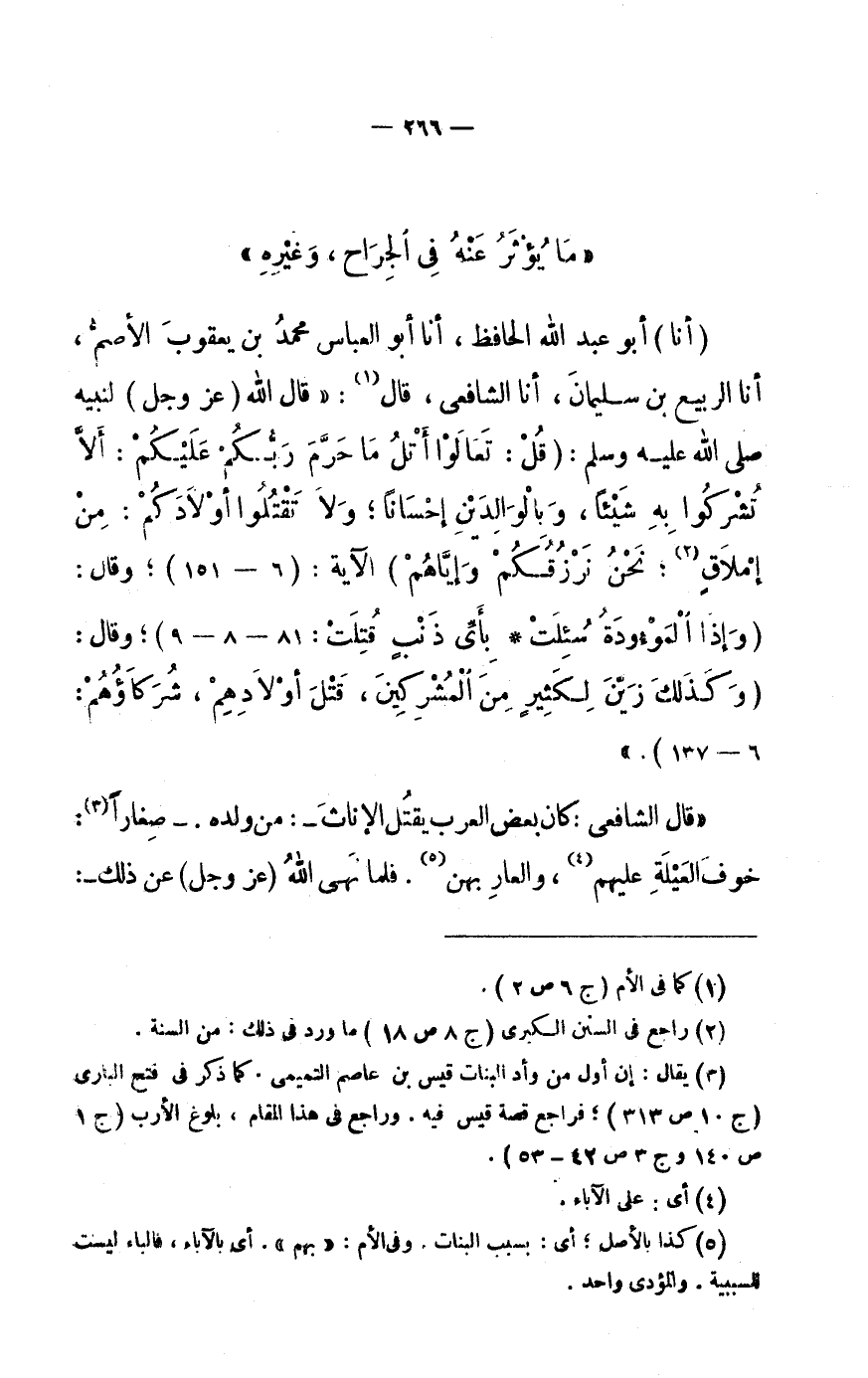«قَالَ الشَّافِعِيُّ: كَانَ بَعْضُ الْعَرَبِ يَقْتُلُ الْإِنَاثَ-: مِنْ وَلَدِهِ.- صِغَارًا «3» :