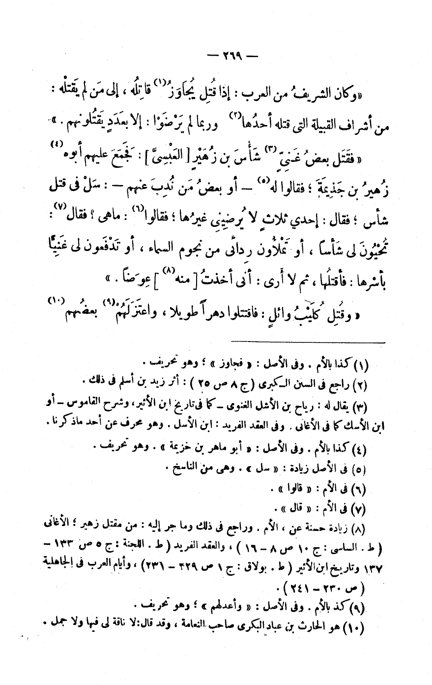 (8) زِيَادَة حَسَنَة عَن، الْأُم. وراجع فى ذَلِك وَمَا جر إِلَيْهِ: من مقتل زُهَيْر الأغانى (ط. الساسى: ج 10 ص 8- 16) ، وَالْعقد الفريد (ط. اللجنة: ج 5 ص 133- 137 وتاريخ ابْن الْأَثِير (ط. بولاق: ج 1 ص 229- 231) ، وَأَيَّام الْعَرَب فى الْجَاهِلِيَّة (ص 230- 241) .