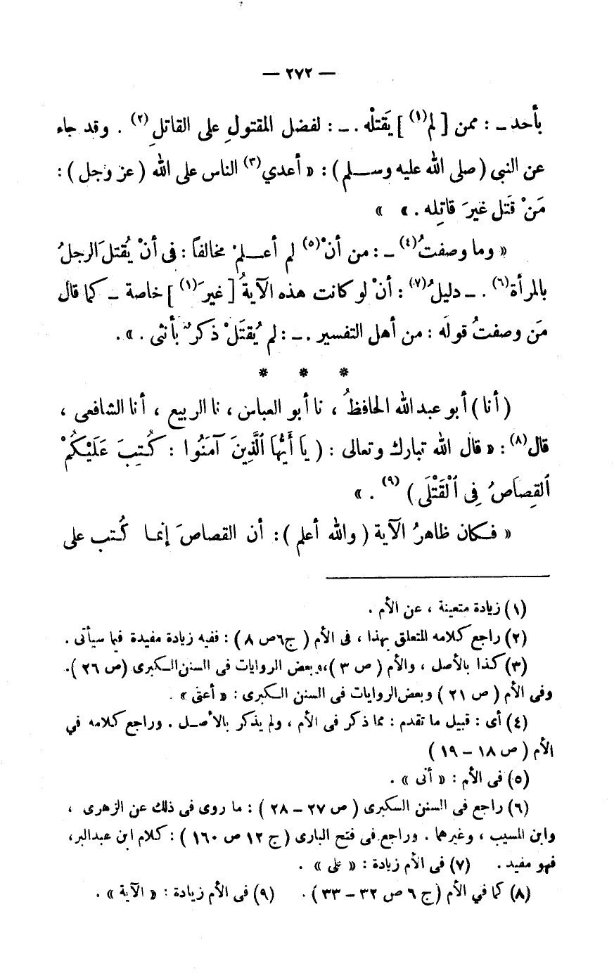 (أَنَا) أَبُو عَبْدِ اللَّهِ الْحَافِظُ، نَا أَبُو الْعَبَّاسِ، نَا الرَّبِيعُ، أَنَا الشَّافِعِيُّ، قَالَ «9» : «قَالَ اللَّهُ تَبَارَكَ وَتَعَالَى: (يَا أَيُّهَا الَّذِينَ آمَنُوا: كُتِبَ عَلَيْكُمُ الْقِصاصُ فِي الْقَتْلى) «10» .»