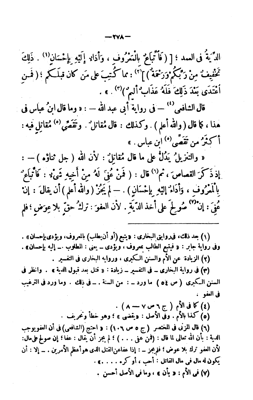 (7) قَالَ الْمُزنِيّ فى الْمُخْتَصر (ج 5 ص 106) : «احْتج (الشَّافِعِي) فى أَن الْعَفو يُوجب الدِّيَة: بِأَن الله تَعَالَى لما قَالَ: (فَمن عفى ... ) لم يجز أَن يُقَال: عَفا إِن صولح على مَال: