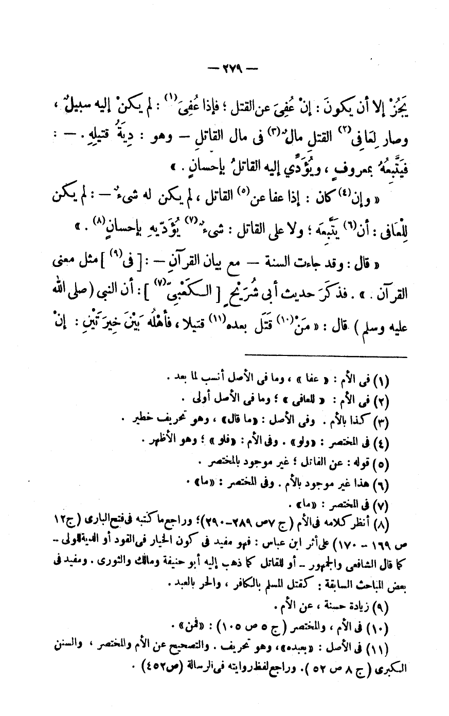 (8) أنظر كَلَامه فى الْأُم (ج 7 ص 289- 290) وراجع مَا كتبه فى فتح الْبَارِي (ج 12 ص 169- 170) على أثر ابْن عَبَّاس: فَهُوَ مُفِيد فى كَون الْخِيَار فى الْقود أَو الدِّيَة للولى- كَمَا قَالَ الشَّافِعِي وَالْجُمْهُور- أَو للْقَاتِل كَمَا ذهب إِلَيْهِ أَبُو حنيفَة وَمَالك وَالثَّوْري. ومفيد فى بعض المباحث السَّابِقَة: كَقَتل الْمُسلم بالكافر، وَالْحر بِالْعَبدِ.