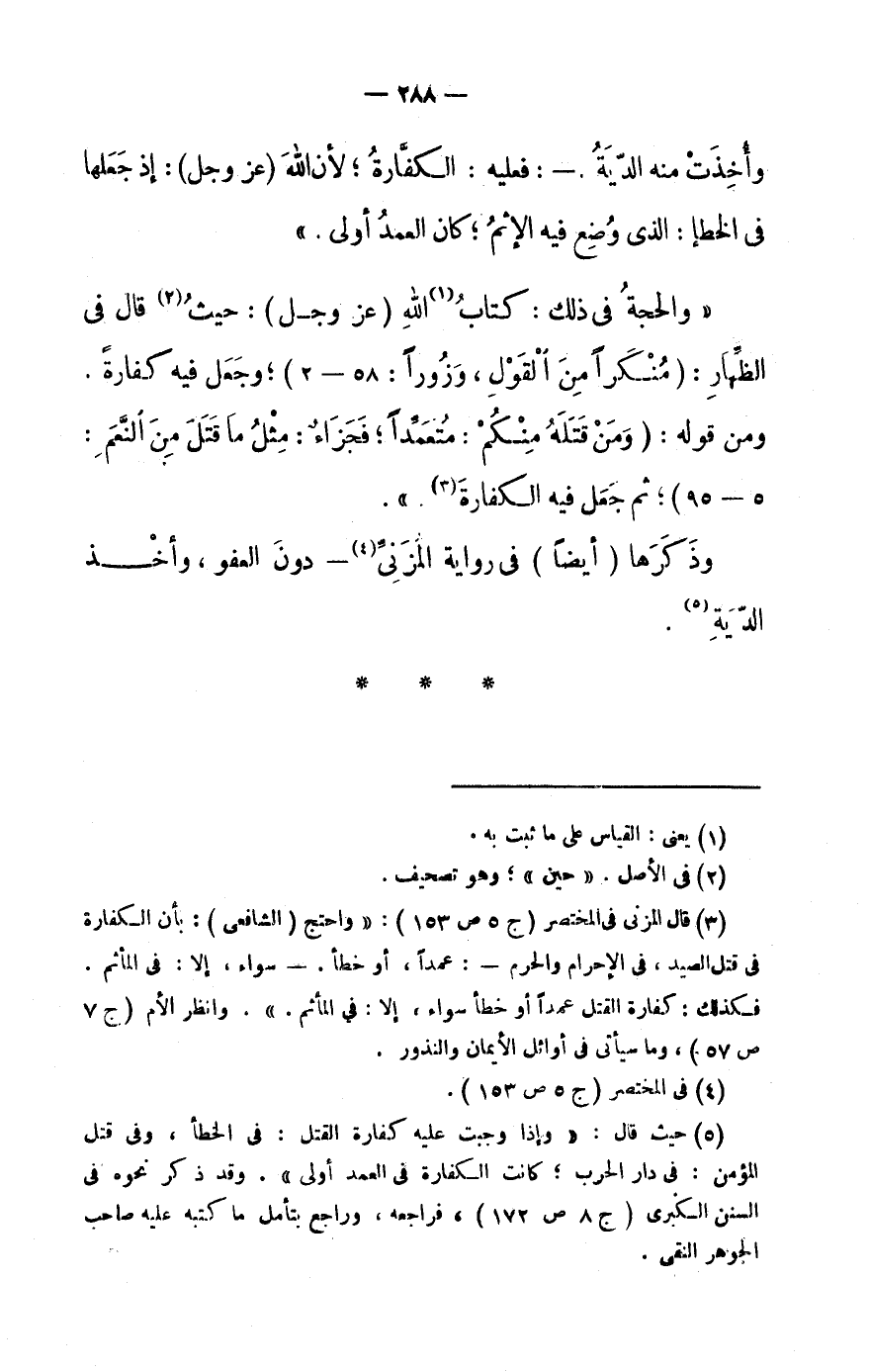 (3) قَالَ الْمُزنِيّ فى الْمُخْتَصر (ج 5 ص 153) : «وَاحْتج (الشَّافِعِي) : بِأَن الْكَفَّارَة فى قتل الصَّيْد، فى الْإِحْرَام وَالْحرم-: عمدا، أَو خطأ.- سَوَاء، إِلَّا: فى المأثم.