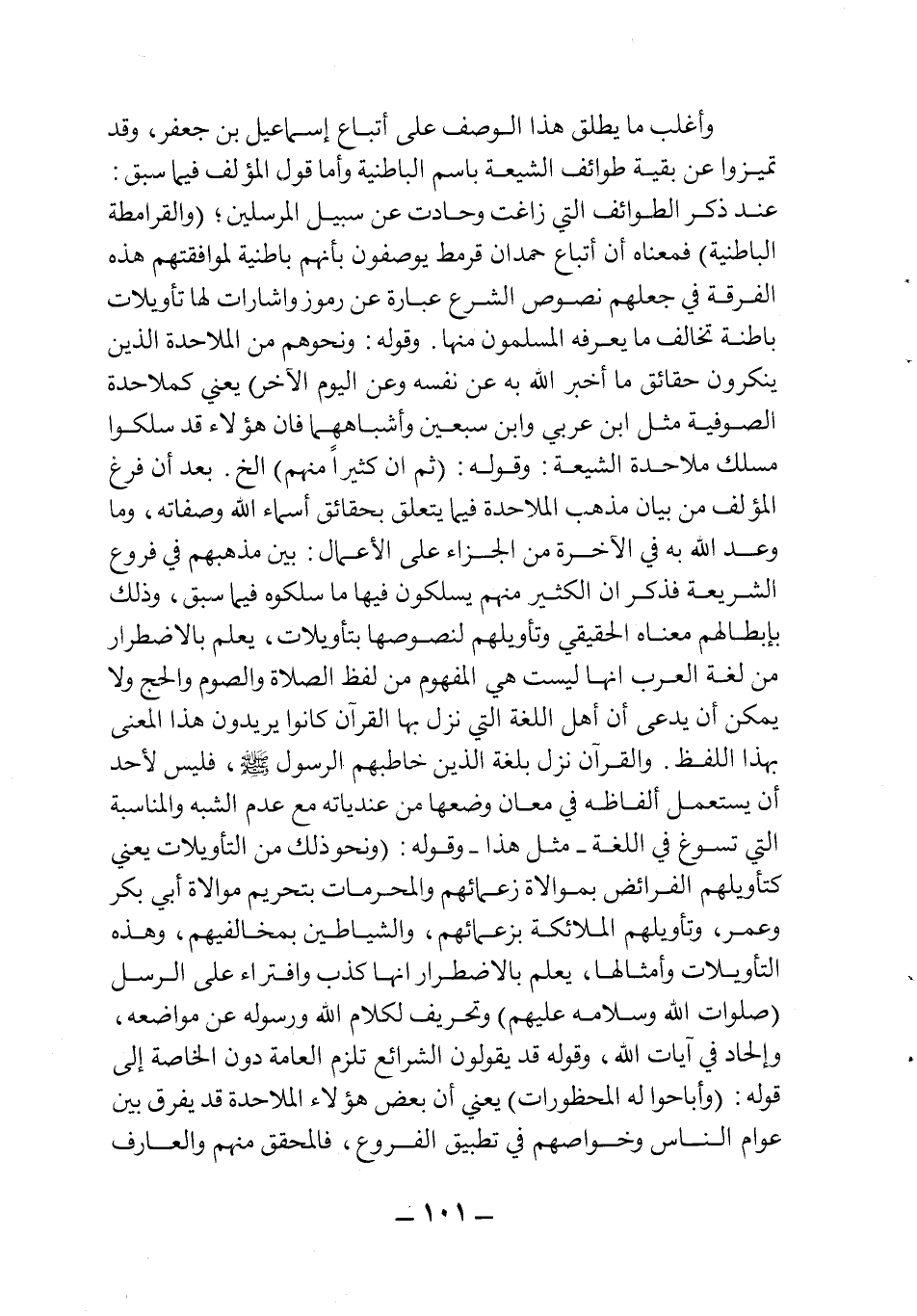 الصوفية مثل ابن عربي وابن سبعين وأشباههما فإن هؤلاء قد ملكوا مسلك ملاحدة الشيعة: وقوله: "ثم أن كثيرا منهم " الخ. بعد أن فرغ المؤلف من بيان مذهب الملاحدة فيما يتعلق بحقائق أسماء الله وصفاته، وما وعد الله به في الآخرة من الجزاء على الأعمال: بين مذهبهم في فروع الشريعة فذكر أن الكثير منهم يسلكون فيها ما سلكوه فيما سبق، وذلك بإبطالهم معناه الحقيقي وتأويلهم لنصوصها بتأويلات، يعلم بالاضطرار من لغة العرب أنها ليست هي المفهوم من لفظ الصلاة والصوم والحج ولا يمكن أن يدعى أن أهل اللغة التي نزل بها القرآن كانوا يريدون هذا المعنى بهذا اللفظ. والقرآن نزل بلغة الذين خاطبهم الرسول صلى الله عليه وسلم، فليس لأحد أن يستعمل ألفاظه في معان وضعها من عندياته مع عدم الشبه والمناسبة التي تسوغ في اللغة. مثل هذا. وقوله: "ونحو ذلك من التأويلات يعني كتأويلهم الفرائض بموالاة زعمائهم والمحرمات بتحريم موالاة أبي بكر وعمر، وتأويلهم الملائكة بزعمائهم والشياطين بمخالفيهم ". وهذه التأويلات وأمثالها، يعلم بالاضطرار أنها كذب وافتراء على الرسل صلوات الله وسلامه عليهم وتخويف لكلام الله ورسوله عن مواضعه، والحاد في آيات الله وقوله قد يقولون الشرائع تلزم العامة دون الخاصة إلى قوله: "وأباحوا له المحظورات" يعني أن بعض هؤلاء الملاحدة قد يفرق بين عوام الناس وخواصهم في تطبيق الفروع، فالمحقق منهم والعارف