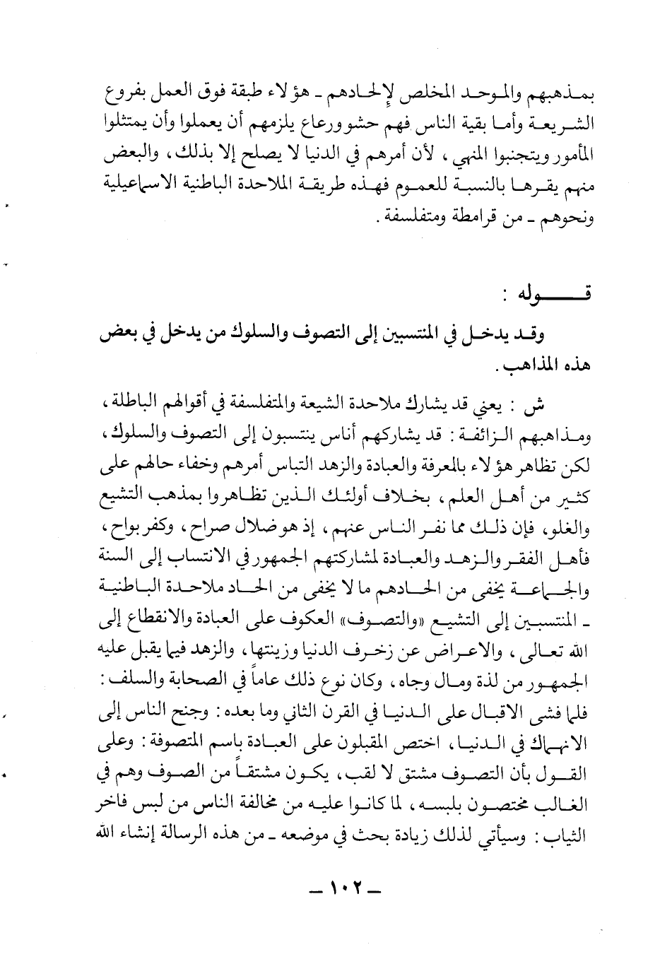 بمذهبهم والموحد المخلص لإلحادهم. هؤلاء طبقة فوق العمل بفروع الشريعة وأما بقية الناس فهم حشو ورعاع يلزمهم أن يعملوا وأن يمتثلوا المأمور ويجتنبوا المنهي، لأن أمرهم في الدنيا لا يصلح إلا بذلك والبعض منهم يقرها بالنسبة للعموم فهذه طريقة الملاحدة الباطنية الإسماعيلية ونحوهم. من قرامطة ومتفلسفة.