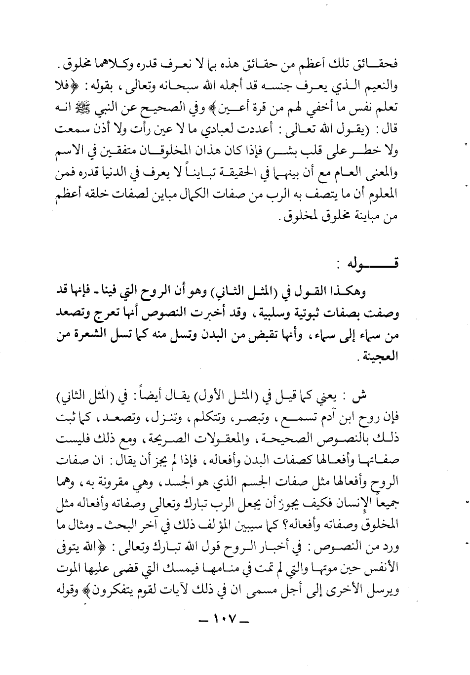 ش: يعني كما قيل في "المثل الأول" يقال أيضا: في "المثل الثاني" فإن روح ابن آدم تسمع، وتبصر، وتتكلم، وتنزل، تصعد، كما ثبت ذلك بالنصوص الصحيحة، والمعقولات الصريحة، ومع ذلك فليست صفاتها وأفعالها كصفات البدن وأفعاله، فإذا لم يجز أن يقال: أن صفات الروح وأفعالها مثل صفات الجسم الذي هو الجسد، وهي مقرونة به، وهما جميعا الإنسان فكيف يجوز أن يجعل الرب تبارك وتعالى وصفاته وأفعاله مثل المخلوق وصفاته وأفعاله؟ كما سيبين المؤلف ذلك في آخر البحث. ومثال ما ورد من النصوص: في أخبار الروح قول الله تبارك وتعالى: {اللَّهُ يَتَوَفَّى الْأنفُسَ حِينَ مَوْتِهَا وَالَّتِي لَمْ تَمُتْ فِي مَنَامِهَا فَيُمْسِكُ الَّتِي قَضَى عَلَيْهَا الْمَوْتَ وَيُرْسِلُ الْأُخْرَى إِلَى أَجَلٍ مُسَمّىً أن فِي ذَلِكَ لَآيات لِقَوْمٍ يَتَفَكَّرُونَ} وقوله