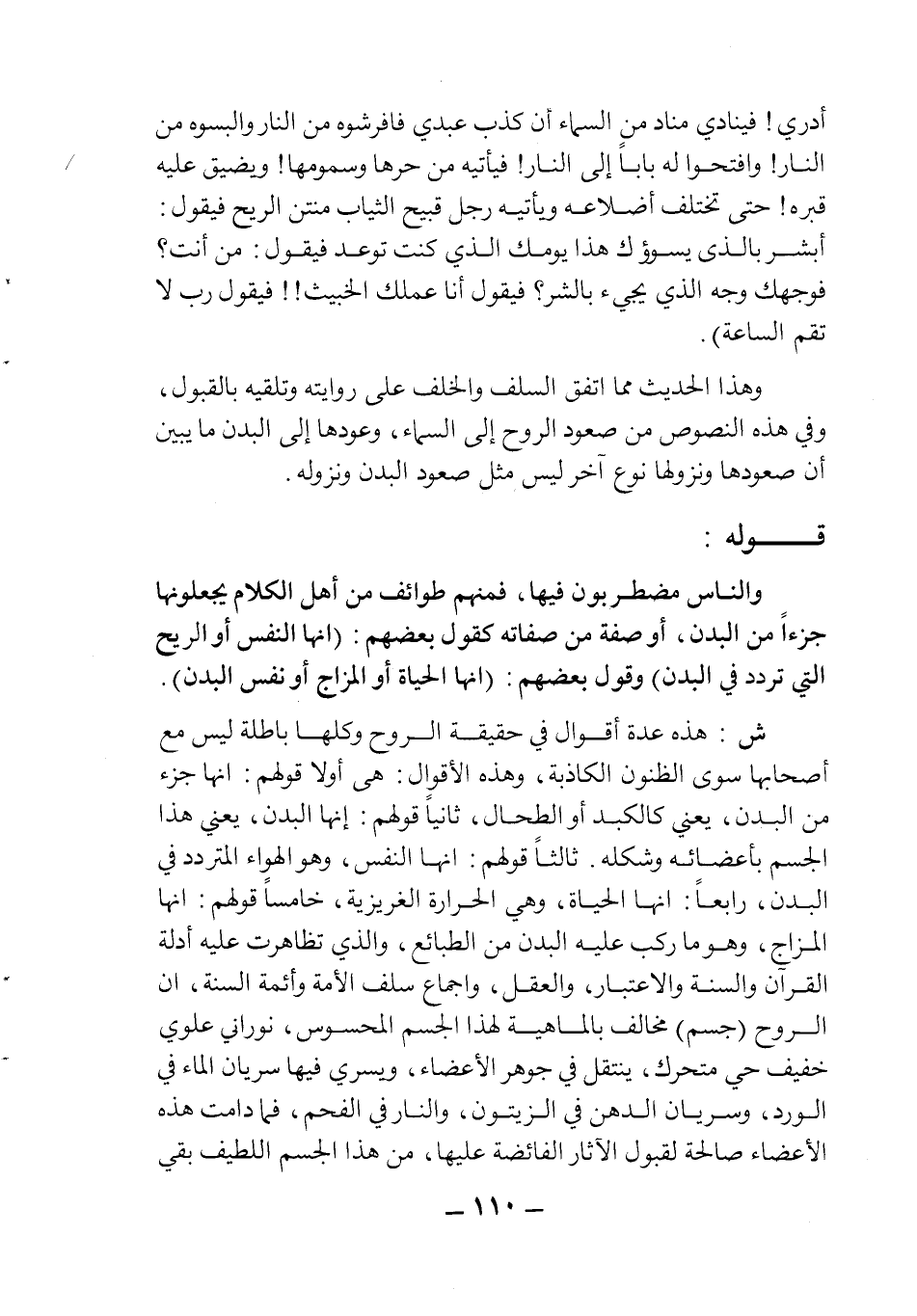 ش: هذه عدة أقوال في حقيقة الروح وكلها باطلة ليس مع أصحابها سوى الظنون الكاذبة، وهذه الأقوال: هي أولا قولهم: أنها جزء من البدن، يعني كالكبد أو الطحال، ثانيا قولهم: أنها البدن، يعني هذا الجسم بأعضائه وشكله. ثالثا قولهم: أنها النفس، وهو الهواء المتردد في البدن، رابعا: أنها الحياة، وهي الحرارة الغريزية، خامسا قولهم: أنها المزاج، وهو ما ركب عليه البدن من الطبائع والذي تظاهرت عليه أدلة القرآن والسنة والاعتبار، والعقل، وإجماع سلف الأمة وأئمة السنة، أن الروح "جسم " مخالف بالماهية لهذا الجسم المحسوس، نوراني علوي خفيف حي متحرك، ينتقل في جوهر الأعضاء، ويسري فيها سريان الماء في الورد، وسريان الدهن في الزيتون، والنار في الفحم، فما دامت هذه الأعضاء صالحة لقبول الآثار الفائضة عليها، من هذا الجسم اللطيف بقي