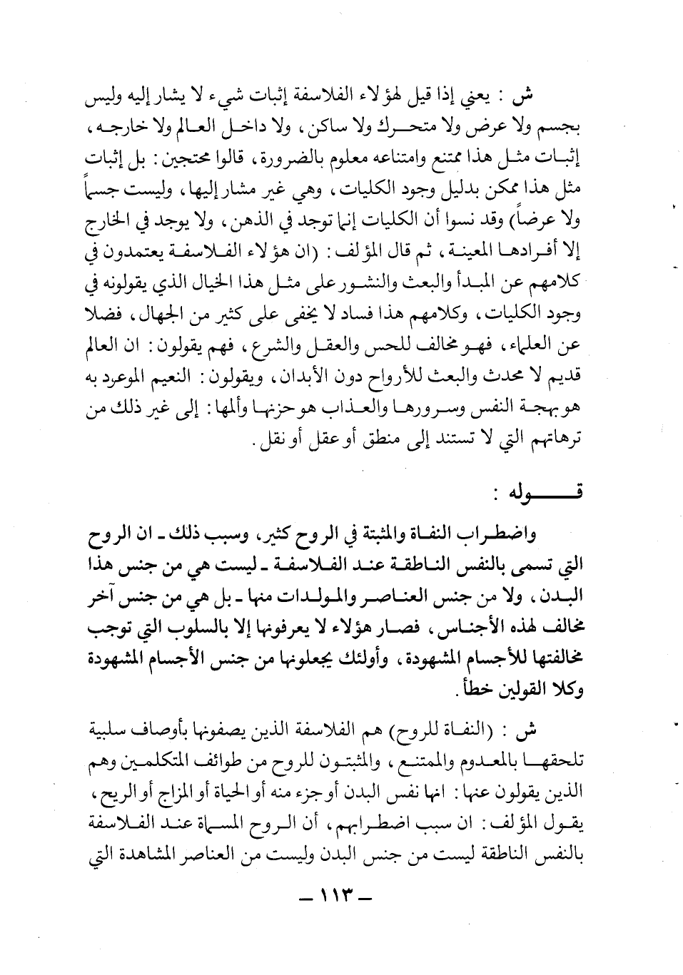 مثل هذا ممكن بدليل وجود الكليات، وهي غير مشار إليها، وليست جسما ولا عرضا" وقد نسوا أن الكليات إنما توجد في الذهن، ولا يوجد في الخارج إلا أفرادها المعينة، ثم قال المؤلف: "إن هؤلاء الفلاسفة يعتمدون في كلامهم عن المبدأ والبعث والنشور على مثل هذا الخيال الذي يقولونه في وجود الكليات، وكلامهم هذا فساد لا يخفى على كثير من الجهال، فضلا عن العلماء، فهو مخالف للحس والعقل والشرع، فهم يقولون: إن العالم قد يم لا محدث والبعث للأرواح دون الأبدان، ويقولون: النعيم الموعود به هو بهجة النفس وسرورها والعذاب هو حزنها وألمها: إلى غير ذلك من ترهاتهم التي لا تستند إلى منطق أو عقل أو نقل.