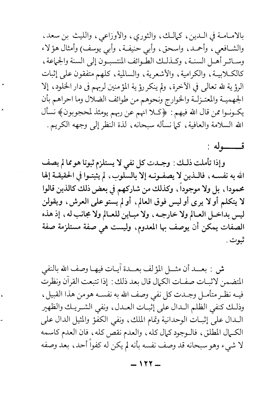 وإذا تأملت ذلك: وجدت كل نفي لا يستلزم ثبوتا هو مما لو يصف الله به نفسه، فالذين لا يصفونه إلا بالسلوب، لم يثبتوا في الحقيقة إلها محمودا، بل ولا موجوداً، وكذلك من شاركهم في بعض ذلك كالذين قالو لا يتكلم أو لا يرى أو ليس فوق العالم، أو لم يستو على العرش، ويقولن ليس بداخل العالم ولا خارجه، ولا مباين للعالم ولا مجانب له، إذ هذه الصفات يمكن أن يوصف بها المعدوم، وليست هي صفة مستلزمة صفة ثبوت