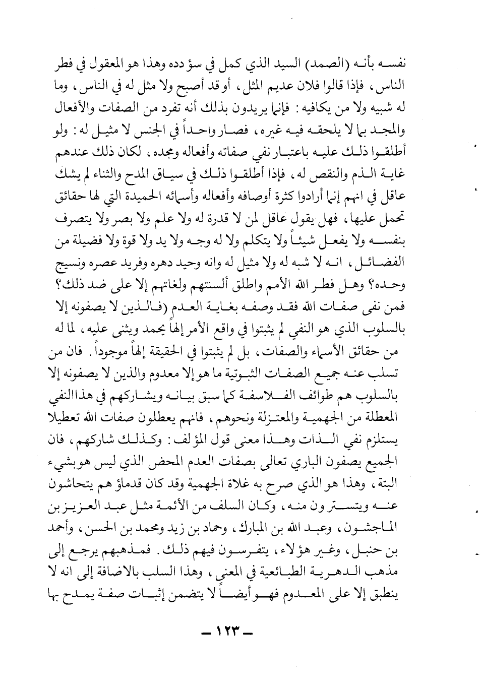 نفسه بأنه "الصمد" السيد الذي كمل في سؤدده وهذا هو المعقول في فطر الناس، فإذا قالو فلان عديم المثل، أو قد أصبح ولا مثل له في الناس، وما له شبيه ولا من يكافيه: فإنما يريدون بذلك أنه تفرد من الصفات والأفعال والمجد بما لا يلحقه فيه غيره، فصار واحداً في الجنس لا مثيل له: ولو أطلقوا ذلك عليه باعتبار نفي صفاته وأفعاله ومجده، لكان ذلك عندهم غاية الذم والنقص له، فإذا أطلقوا ذلك في سياق المدح والثناء لم يشك عاقل في أنهم إنما أرادوا كثرة أوصافه وأفعاله وأسمائه الحميدة التي لها حقائق تحمل عليها، فهل يقول عاقل لمن لا قدرة له ولا علم ولا بصر ولا يتصرف بنفسه ولا يفعل شيئاً ولا يتكلم ولا له وجه ولا يد ولا قوة ولا فضيلة من الفضائل، أنه لا شبه له ولا مثيل له وأنه وحيد دهره وفريد عصره ونسيج وحده؟ وهل فطر الله الأمم وأطلق ألسنتهم ولغاتهم إلا على ضد ذلك؟ فمن نفى صفات الله فقد وصفه بغاية العدم "فالذين لا يصفونه إلا بالسلوب الذي هو النفي لم يثبتوا في واقع الأمر إلهاً يحمد ويثنى عليه، لما له من حقائق الأسماء والصفات، بل لم يثبتوا في الحقيقة إلهاً موجوداً. فإن من تسلب عنه جميع الصفات الثبوتيه ما هو إلا معدوم والذين لا يصفونه إلا بالسلوب هم طوائف الفلاسفة كما سبق بيانه ويشاركهم في هذا النفي المعطلة من الجهمية والمعتزلة ونحوهم، فإنهم يعطلون صفات الله تعطيلا يستلزم نفي الذات وهذا معنى قول المؤلف: وكذلك شاركهم، فإن الجميع يصفون الباري تعالى بصفات العدم المحض الذي ليس هو بشيء البتة، وهذا هو الذي صرح به غلاة الجهمية وقد كان قدماؤهم يتحاشون عنه ويتسترون منه، وكان السلف من الأئمة مثل عبد العزيز بن الماجشون، وعبد الله بن المبارك، وحماد بن زيد ومحمد بن الحسن، وأحمد بن حنبل، وغيرهم هؤلاء، يتفرسون فيهم ذلك. فمذهبهم يرجع إلى مذهب الدهرية الطبائعية في المعنى، وهذا السلب بالإضافة إلى أنه لا ينطبق إلا على المعدوم فهو أيضاً لا يتضمن إثبات صفة يمدح بها