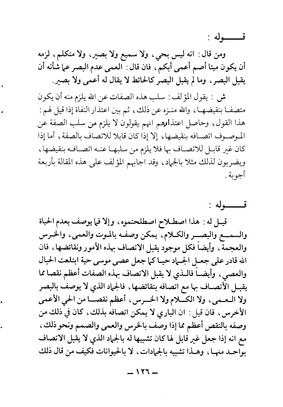ش: يقول المؤلف: سلب هذه الصفات عن الله يلزم منه أن يكون متصفا بنقيضها، والله منزه عن ذلك، ثم بين اعتذار النفاة إذا قيل لهم: هذا القول، وحاصل اعتذارهم أنهم يقولون لا يلزم من سلب الصفة عن الموصوف اتصافه بنقيضها، إلا إذا كان قابلا للاتصاف بالصفة، أما إذا كان غير قابل للاتصاف بها فلا يلزم من سلبها عنه اتصافه بنقيضها ويضربون لذلك مثلا بالجماد، وقد أجابهم المؤلف على هذه المقالة بأربعة أجوبة.