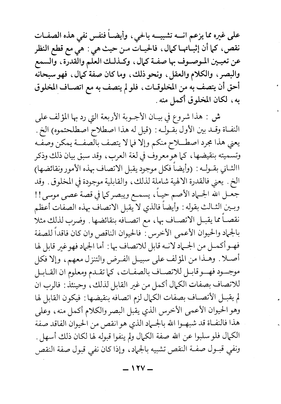 ش: هذا مشروع في بيان الأجوبة الأربعة التي رد بها المؤلف على النفاة وقد بين الأول بقوله: "قيل له هذا اصطلاح اصطلحتموه"الخ. يعني هذا مجرد اصطلاح منكم وإلا فمالا يتصف بالصفة يمكن وصفه وتسميته بنقيضها، كما هو معروف في لغة العرب، وقد سبق بيان ذلك وذكر الثاني بقوله: "وأيضاً فكل موجود يقبل الاتصاف بهذه الأمور ونقائضها" الخ. يعني فالقدرة الإلهية شاملة لذلك، والقابلية موجودة في المخلوق وقد جعل الله الجماد الأصم حيا، يسمع ويبصر كما في قصة عصى موسى!! وبين الثالث بقوله: وأيضاً فالذي لا يقبل الاتصاف بهذه الصفات أعظم نقصاً مما يقبل الاتصاف بها، مع اتصافه بنقائضها. وضرب لذلك مثلا بالجماد والحيوان الأعمى الأخرس: فالحيوان الناقص وإن كان فاقداً للصفة فهو أكمل من الجماد لأنه قابل للاتصاف بها: أما الجماد فهو غير قابل لها أصلا. وهذا من المؤلف على سبيل الفرض والتنزل معهم، وإلا فكل موجود فهو قابل للاتصاف بالصفات، كما تقدم ومعلوم أن القابل للاتصاف بصفات الكمال أكمل من غير القابل لذلك، وحينئذ: فالرب إن لم يقبل الاتصاف بصفات الكمال لزم اتصافه بنقيضها: فيكون القابل لها وهو الحيوان الأعمى الأخرس الذي يقبل البصر والكلام أكمل منه، وعلى هذا فالنفاة قد شبهوا الله بالجماد الذي هو أنقص من الحيوان الفاقد صفة الكمال فلو سلبوا عن الله صفة الكمال ولم ينفوا قبوله لها لكان ذلك أسهل. ونفي قبول صفة النقص تشبيه بالجماد، وإذا كان نفي قبول صفة النقص