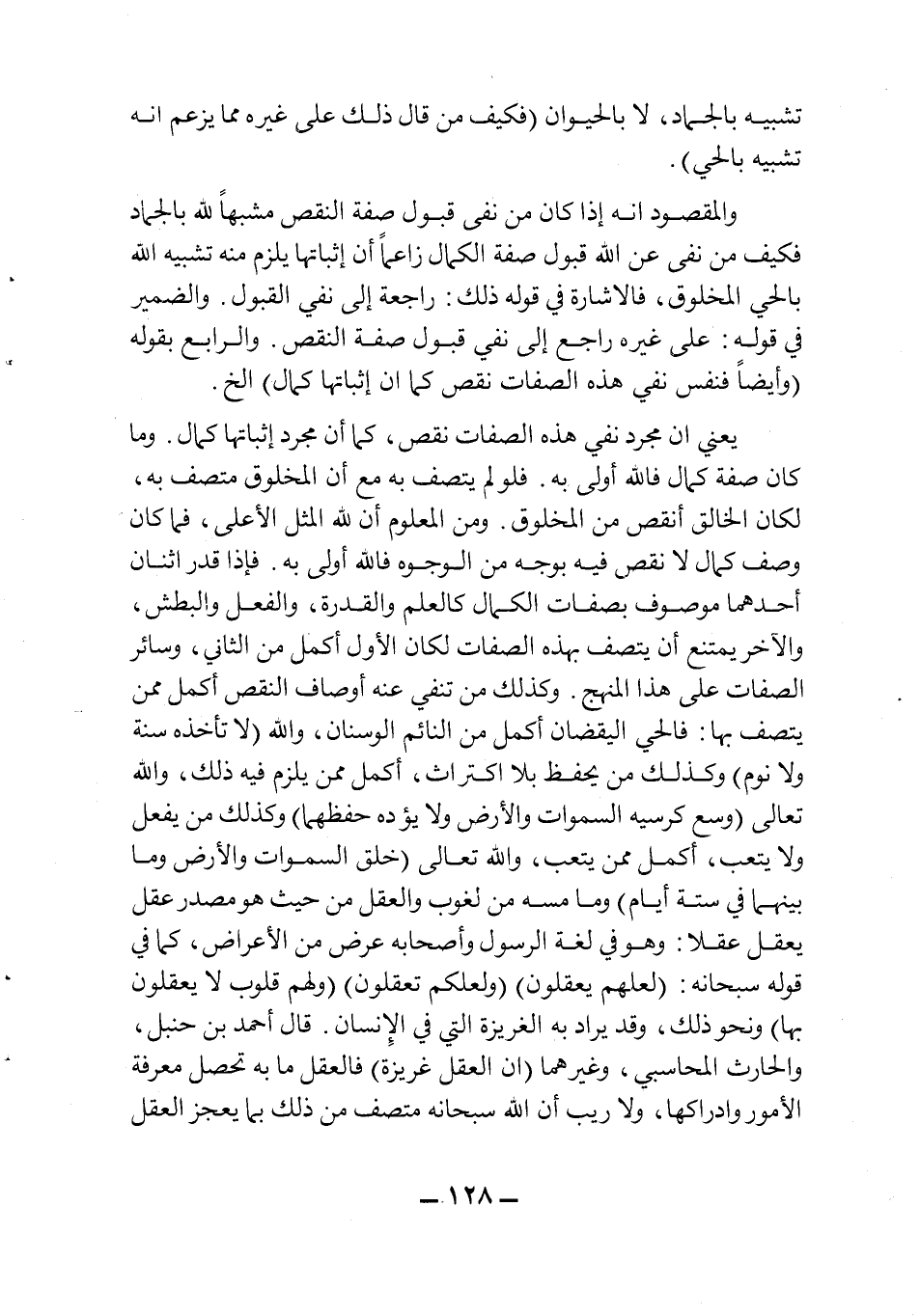 يعني أن مجرد نفي هذه الصفات نقص، كما أن مجرد إثباتها كمال. وما كان صفة كمال فالله أولى به. فلو لم يتصف به مع أن المخلوق متصف به، لكان الخالق أنقص من المخلوق. ومن المعلوم أن لله المثل الأعلى، فما كان وصف كمال لا نقص فيه بوجه من الوجوه فالله أولى به. فإذا قدر اثنان أحدهما موصوف بصفات الكمال كالعلم والقدرة، والفعل والبطش، والآخر يمتنع أن يتصف بهذه الصفات لكان الأول أكمل من الثاني، وسائر الصفات بها: فالحي اليقضان أكمل من النائم الوسنان، والله "لا تأخذه سنة ولا نوم" وكذلك من يحفظ بلا اكتراث، أكمل ممن يلزم فيه ذلك، والله تعالى "وسع كرسيه السموات والأرض ولا يؤده حفظهما" وكذلك من يفعل ولا يتعب، أكمل ممن يتعب، والله تعالى "خلق السموات والأرض وما بينهما في ستة أيام" وما مسه من لغوب والعقل من حيث هو مصدر عقل يعقل عقلا: وهو في لغة الرسول وأصحابه عرض من الأعراض، كما في قوله سبحانه: "لعلهم يعقلون" "ولعلكم تعقلون" "ولهم قلوب لا يعقلون بها" ونحو ذلك، وقد يراد به الغريزة التي في الإنسان. قال أحمد بن حنبل، والحارث المحاسبي، وغيرهما "أن العقل غريزة" فالعقل ما به تحصل معرفة الأمور وإدراكها، ولا ريب أن الله سبحانه متصف من ذلك بما يعجز العقل
