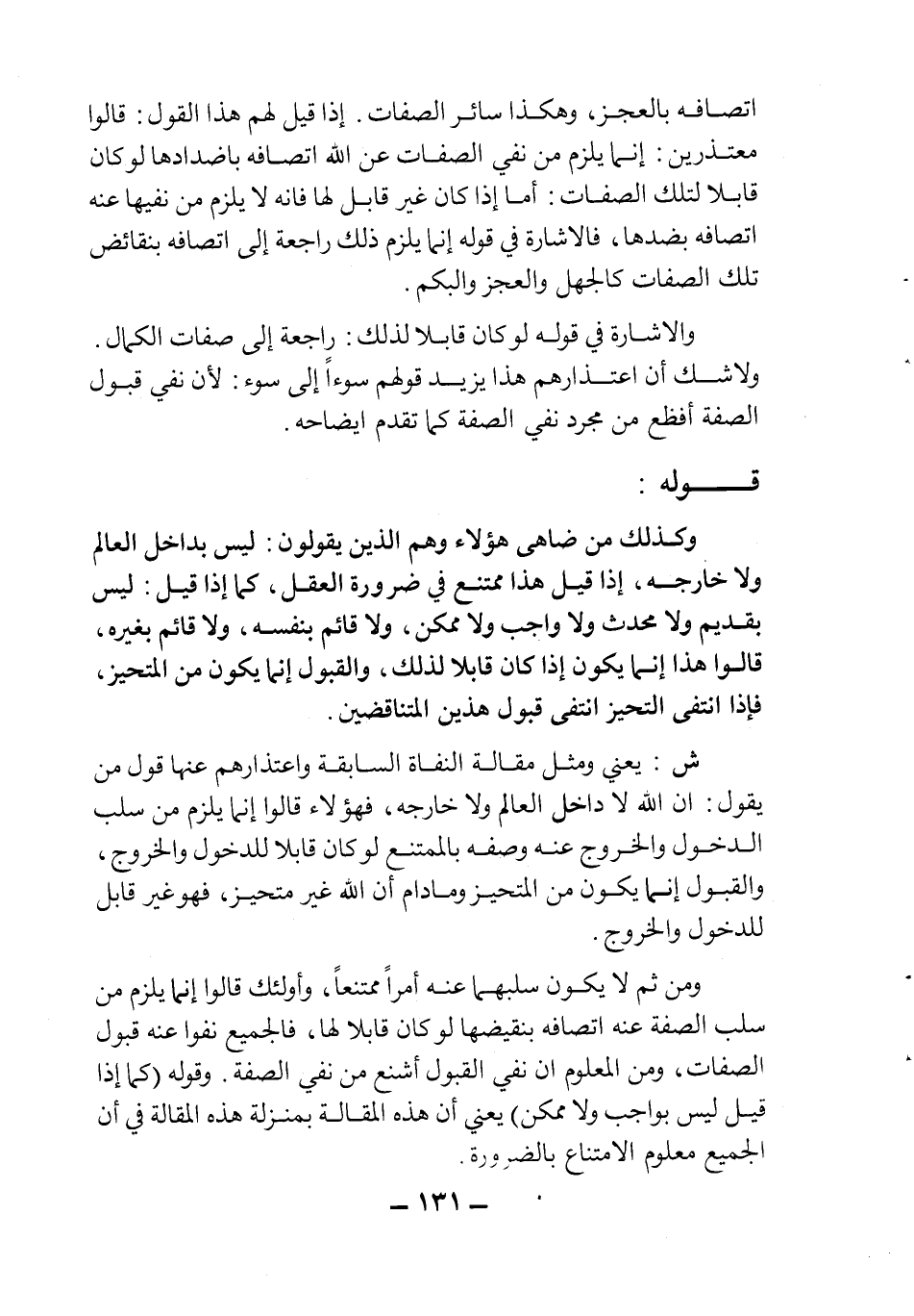 اتصافه بالعجز، وهكذا سائر الصفات. إذا قيل لهم هذا القيل: قالوا معتذرين: إنما يلزم من نفي الصفات عن الله اتصافه بأضدادها لو كان قابلا لتلك الصفات: أما إذا كان غير قابل لها فإنه لا يلزم من نفيها عنه اتصافه بضدها، فالإشارة في قوله إنما يلزم ذلك راجعة إلى اتصافه بنقائض تلك الصفات كالجهل والعجز والبكم.