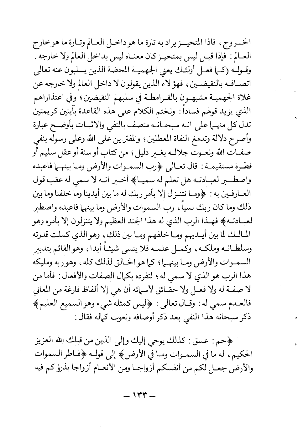 الخروج، فإذا المتحيز يراد به تارة ما هو داخل العالم وتارة ما هو خارج العالم: فإذا قيل ليس بمتحيز كان معناه ليس بداخل العالم ولا خارجه. وقوله "كما فعل أولئك يعني الجهمية المحضة الذين يسلبون عنه تعالى اتصافه بالنقيضين، فهؤلاء الذين يقولون لا داخل العالم ولا خارجه عن غلاة الجهمية مشبهون بالقرامطة في سلبهم النقيضين، وفي اعتذاراهم الذي يزيد قولهم فساداً: ونختم الكلام على هذه القاعدة بآيتين كريمتين تدل كل منهما على أنه سبحانه متصف بالنفي والإثبات بأوضح عبارة وأصرح دلالة وتدمغ النفاة المعطلين، والمفترين على الله وعلى رسوله بنفي صفات الله ونعوت جلاله بغير دليل، من كاتب أو سنة أو عقل سليم أو فطرة مستقيمة: قال تعالى {رَبُّ السَّمَاواتِ وَالْأَرْضِ وَمَا بَيْنَهُمَا فَاعْبُدْهُ وَاصْطَبِرْ لِعِبَادَتِهِ هَلْ تَعْلَمُ لَهُ سَمِيا} أخبر أنه لا سمي له عقب قول العارفين به: {وَمَا نَتَنَزَّلُ إِلَّا بِأَمْرِ رَبِّكَ لَهُ مَا بَيْنَ أيدِينَا وَمَا خَلْفَنَا وَمَا بَيْنَ ذَلِكَ وَمَا كان رَبُّكَ نَسِيا رَبُّ السَّمَاواتِ وَالْأَرْضِ وَمَا بَيْنَهُمَا فَاعْبُدْهُ وَاصْطَبِرْ لِعِبَادَتِهِ} فهذا الرب الذي له الجند العظيم ولا يتنزل إلا بأمره وهو المالك لما بين أيديهم وما خلفهم وما بين ذلك، وهو الذي كملت قدرته وسلطانه وملكه، وكمل علمه فلا ينسى شيئاً أبدا، وهو القائم بتدبير السموات والأرض وما بينهما، كما هو الخالق لذلك كله، وهو ربه ومليكه هذا الرب هو الذي لاسمي له، لتفرده بكمال الصفات والأفعال: فأما من لا صفة له ولا فعل ولا حقائق لأسمائه أن هي إلا ألفاظ فارغة من المعاني فالعدم سمي له: قال تعالى {لَيْسَ كَمِثْلِهِ شَيْءٌ وَهُوَ السَّمِيعُ الْبَصِيرُ} ذكر سبحانه هذا النفي بعد ذكر أوصافه ونعوت كماله فقال: