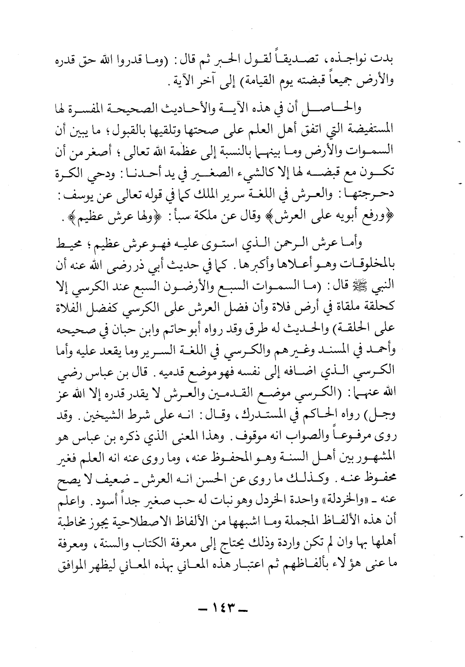 وأما عرش الرحمن الذي استوى عليه فهو عرش عظيم، محيط بالمخلوقات وهو أعلاها وأكبرها. كما في حديث أبي ذر رضي الله عنه أن النبي صلى الله عليه وسلم قال: "ما السماوات السبع والأرضون السبع عند الكرسي إلا على الحلقة" والحديث له طرق وقد رواه أبو حاتم وابن حبان في صحيحه وأحمد في المسند وغيرهم والكرسي في اللغة السرير وما يقعد عليه وأما الكرسي الذي أضافه إلى نفسه فهو موضع قدميه. قال ابن عباس رضي الله عنهما: "الكرسي موضع القدمين والعرش لا يقدر قدره إلا الله عز وجل" رواه الحاكم في المستدرك، وقال: أنه على شرط الشيخين. وقد روى مرفوعاً والصواب أنه موقوف. وهذا المعنى الذي ذكره بن عباس هو المشهور بين أهل السنة وهو المحفوظ عنه، وما روى عنه أنه العلم فغير محفوظ عنه. وكذلك ما روى عن الحسن أنه العرش_ ضعيف لا يصح عنه_ "والخردلة" واحدة الخردل وهو نبات له حب صغير جداً أسود. واعلم أن هذه الألفاظ المجملة وما أشبهها من الألفاظ الاصطلاحية يجوز مخاطبة أهلها بها وأن لم تكن واردة وذلك يحتاج إلى معرفة الكتاب والسنة، ومعرفة ما عنى هؤلاء بألفاظهم ثم اعتبار هذه المعاني ليظهر الموافق