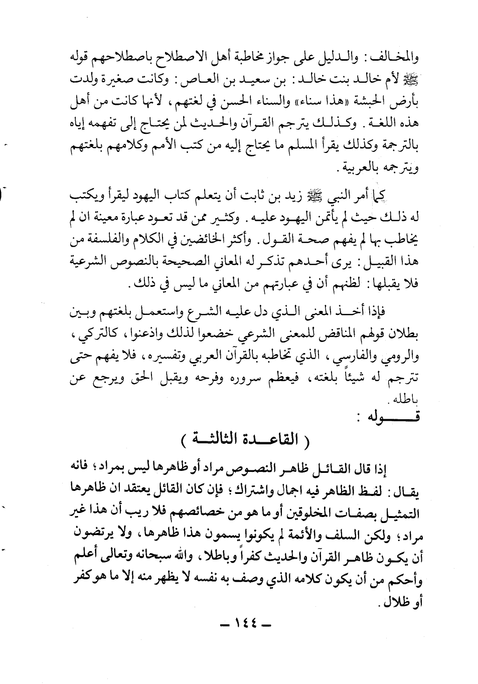 والمخالف: والدليل على جواز مخاطبة أهل الاصطلاح باصطلاحهم قوله صلى الله عليه وسلم لأم خالد بنت خالد: بن سعيد بن العاص: وكانت صغيرة ولدت بأرض الحبشة "هذا سناء" والسناء الحسن في لغتهم، لأنها كانت من أهل هذه اللغة. وكذلك يترجم القرآن في لغتهم، لأنها كانت من أهل هذه اللغة. وكذلك يقرأ المسلم ما يحتاج إليه من كتب الأمم وكلامهم بلغتهم ويترجمه بالعربية.