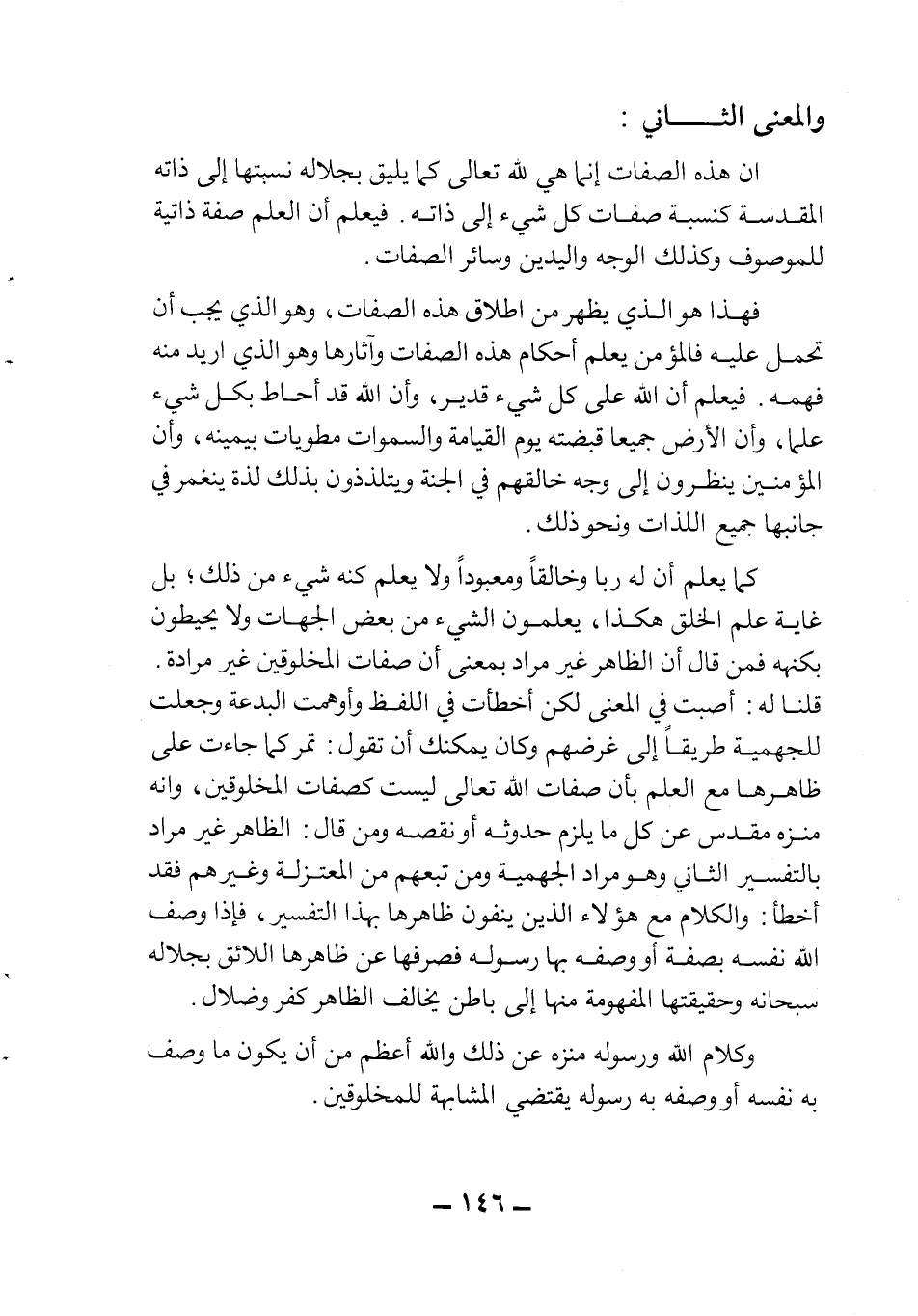 فهذا هو الذي يظهر من إطلاق هذه الصفات، وهو الذي يجب أن تحمل عليه فالمؤمن يعلم أحكام هذه الصفات وآثارها وهو الذي أريد منه فهمه. فيعلم أن الله على كل شيء قدير، وأن الله قد أحاط بكل شيء علما، وأن الأرض جميعا قبضته يوم القيامة والسموات مطويات بيمينه، وأن المؤمنين ينظرون إلى وجه خالقهم في الجنة ويتلذذون بذلك لذة ينغمر في جانبها ونحو ذلك.