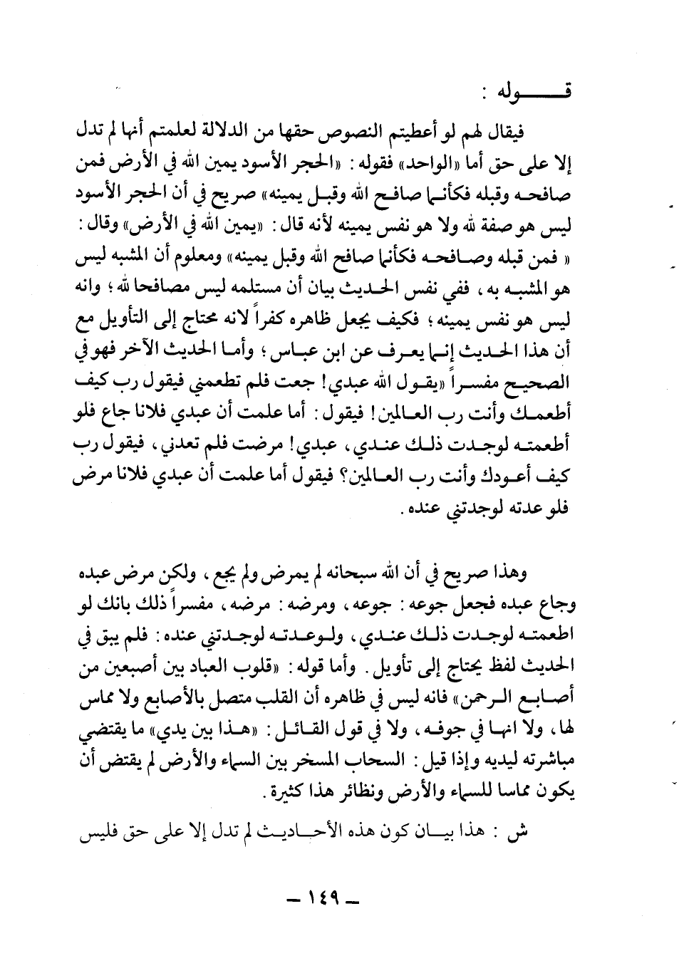 فيقال لهم لو أعطيتم النصوص حقها من الدلالة لعلمتم أنها لم تدل إلا على حق أما "الواحد" فقوله: "الحجر الأسود يمين الله في الأرض فمن صافحه وقبله فكأنما صافح الله وقبل يمينه" صريح في أن الحجر الأسود ليس هو صفة الله ولا هو نفس يمينه لأنه قال: "يمين الله في الأرض" وقال: "فمن قبله وصافحه فكأنما صافح الله وقبل يمينه" ومعلوم أن المشبه ليس هو المشبه به، ففي نفس الحديث بيان أن مستلمه ليس مصافحا لله، وإنه ليس هو نفس يمينه، فكيف يجعل ظاهره كفراً لأنه محتاج إلى التأويل مع أن هذا الحديث إنما يعرف عن ابن عباس، وأما الحديث الآخر فهو في الصحيح مفسراً "يقول الله عبدي! جعت فلم تطعمني فيقول رب كيف أطعمك وأنت رب العالمين! فيقول: أما علمت أن عبدي فلانا جاع فلو أطعمته لوجدت ذلك عندي، عبدي! مرضت فلم تعدني، فيقول رب كيف أعودك وأنت رب العالمين؟ فيقول أما علمت أن عبدي فلانا مرض فلو عدته لوجدتني عنده.