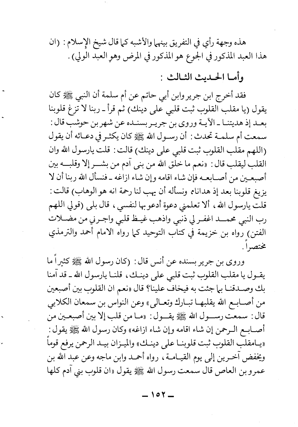 وروى بن جرير بسنده عن أنس قال: " كان رسول الله صلى الله عليه وسلم كثيراً ما يقول يا مقلب القلوب ثبت قلبي على دينك، قلنا يا رسول الله_ قد آمنا بك وصدقنا بما جئت به فيخاف علينا؟ قال "نعم إن القلوب بين أصبعين من أصابع الله يقلبها تبارك وتعالى" وعن النواس بن سمعان الكلابي قال: سمعت رسول الله صلى الله عليه وسلم يقول: "ما من قلب إلا بين أصبعين من أصابع الرحمن أن شاء أقامه وأن شاء أزاغه" وكان رسول الله صلى الله عليه وسلم يقول: "يا مقلب القلوب ثبت قلوبنا على دينك" والميزان بيد الرحمن يرفع قوماً ويخفض آخرين إلى يوم القيامة، رواه أحمد وابن ماجد وعن عبد الله بن عمرو بن العاص قال سمعت رسول الله صلى الله عليه وسلم يقول "إن قلوب بني آدم كلها