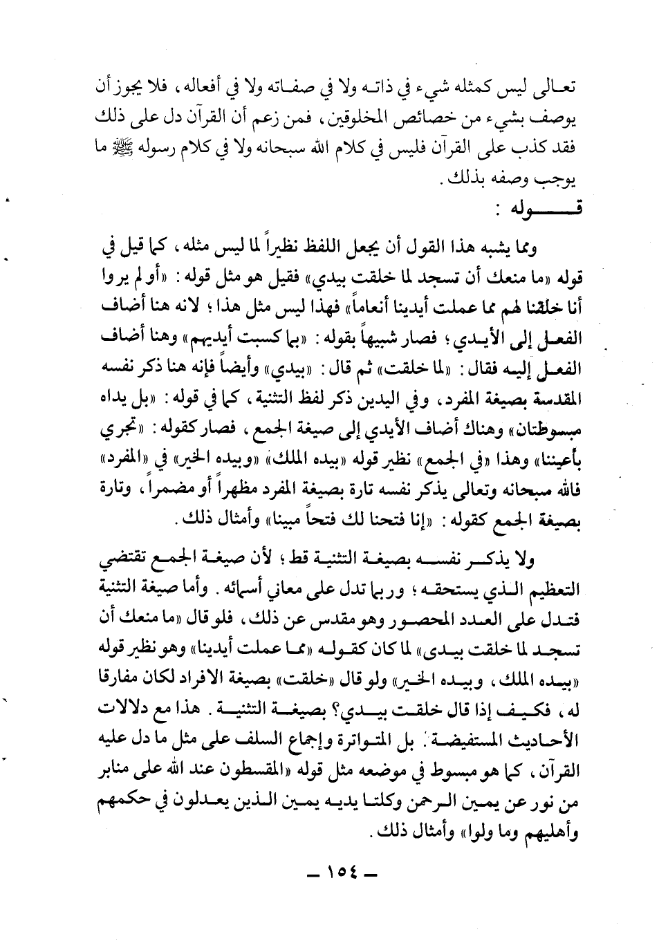 ولا يذكر نفسه بصيغة التثنية قط، لأن صيغة الجمع تقتضي التعظيم الذي يستحقه، وربما تدل على معاني أسمائه. وأما صيغة التثنية فتدل على العدد المحصور وهو مقدس عن ذلك فلو قال {مَا مَنَعَكَ أَنْ تَسْجُدَ لِمَا خَلَقْتُ بِيَدَيَّ} لما كان كقوله: {مِمَّا عَمِلَتْ أَيْدِينَا} وهو نظير قوله: {بِيَدِهِ الْمُلْكُ} ، "وبيده الخير" ولو قال: "خلقت" بصيغة الإفراد لكان مفارقا له، فكيف إذا قال خلقت بيدي؟ بصيغة التثنية. هذا مع دلالات الأحاديث المستفيضة. بل المتواترة وإجماع السلف على مثل ما دل عليه القرآن، كما هو مبسوط في موضعه مثل قوله: "المقسطون عند الله على منابر من نور عن يمين الرحمن وكلتا يديه يمين الذين يعدلون في حكمهم وأهليهم وما ولوا" وأمثال ذلك.