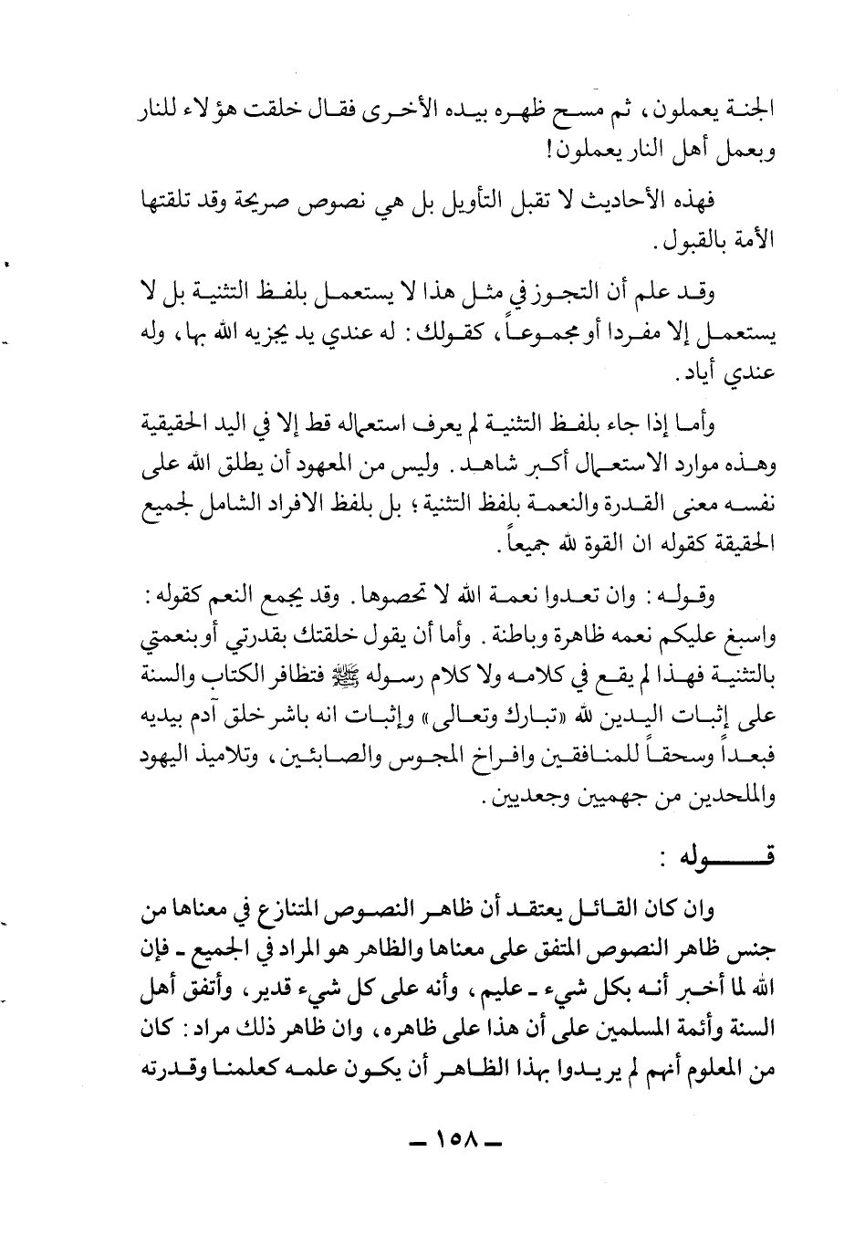 وأما إذا جاء بلفظ التثنية لم يعرف استعماله قط إلا في اليد الحقيقة وهذه موارد الاستعمال أكبر شاهد. وليس من المعهود أن يطلق الله على نفسه معنى القدرة والنعمة بلفظ التثنية، بل يلفظ الإفراد الشامل لجميع الحقيقة كقوله إن القوة لله جميعا.