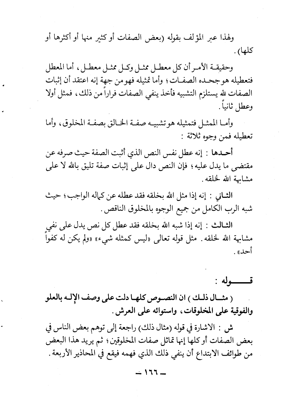 ش: الإشارة في قوله "مثال ذلك" راجعة إلى توهم بعض الناس في بعض الصفات أو كلها أنها تماثل صفات المخلوقين، ثم يريد هذا البعض من طوائف الابتداع أن ينفي ذلك الذي فهمه فيقع في المحاذير الأربعة.
