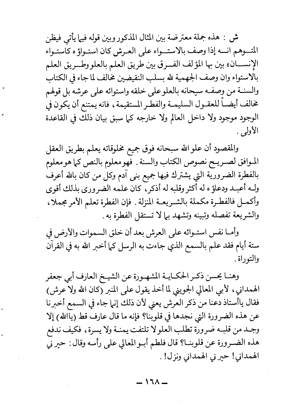 وهنا يحسن ذكر الحكاية المشهورة عن الشيخ العارف أبي جعفر الهمداني، لأبي المعالي يقول على المنبر "كان الله ولا عرش" فقال يا أستاذ دعنا من ذكر العرش يعني لأن ذلك إنما جاء في السمع أخبرنا عن هذه الضرورة التي نجدها في قلوبنا؟ فإنه ما قال عارف قط "يا الله" إلا وجد من قلبه ضرورة تطلب العلو لا تلتفت يمنة ولا يسرة، فكيف ندفع هذه الضرورة عن قلوبنا؟ قال فلطم أبو المعالي على رأسه وقال: حيرني الهمداني! حيرني الهمداني ونزل!.