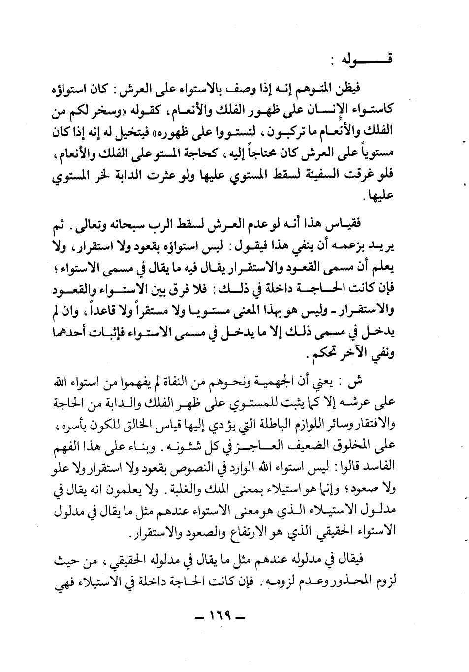 فقياس هذا أنه لو عدم العرش لسقط الرب سبحانه وتعالى. ثم يريد بزعمه أن ينفي هذا فيقول: ليس استواؤه بقعود ولا استقرار، ولا يعلم أن مسمى القعود والاستقرار يقال فيه ما يقال في مسمى الاستواء، فإن كانت الحاجة داخلة في ذلك: فلا فرق بين الاستواء والقعود والاستقرار_ وليس هو بهذا المعنى مستويا ولا مستقراً ولا قاعداً، وإن لم يدخل في مسمى ذلك إلا ما يدخل في مسمى الاستواء فإثبات أحدهما ونفي الآخر تحكم.