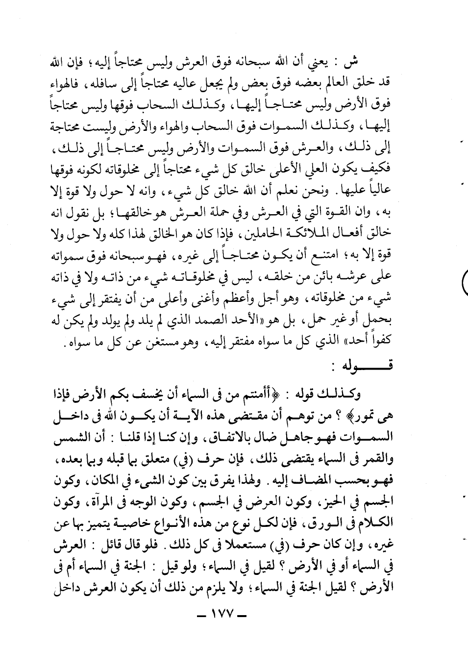 ش: يعني أن الله سبحانه فوق العرش وليس محتاجاً إليه، فإن الله قد خلق العالم بعضه فوق بعض ولم يجعل عاليه محتاجاً إلى سافله، فالهواء فوق الأرض وليس محتاجاً إليها، وكذلك السحاب فوقها وليس محتاجاً إليها، وكذلك السموات فوق السحاب والهواء والأرض وليست محتاجة إلى ذلك، والعرش فوق السموات والأرض وليس محتاجاً إلى ذلك، فكيف يكون العلي الأعلى خالق كل شيء محتاجا إلى مخلوقاته لكونه فوقها عاليا عليها. ونحن نعلم أن الله خالق كل شيء، وأنه لا حول ولا قوة إلا به، وأن القوة التي في العرش وفي حملة العرش هو خالقها، بل نقول أنه خالق أفعال الملائكة الحاملين، فإذا كان هو الخالق لهذا كله ولا حول ولا قوة إلا به، امتنع أن يكون محتاجاً إلى غيره، فهو سبحانه فوق سماواته على عرشه بائن من خلقه، ليس في مخلوقاته شيء من ذاته ولا في ذاته شيء من مخلوقاته، وهو أجل وأعظم وأغنى وأعلى من أن يفتقر إلى شيء بحمل أو غير حمل، بل هو "الأحد الصمد الذي لم يلد ولم يولد ولم يكن له كفواً أحد" الذي كل ما سواه مفتقر إليه، وهو مستغن عن كل ما سواه.