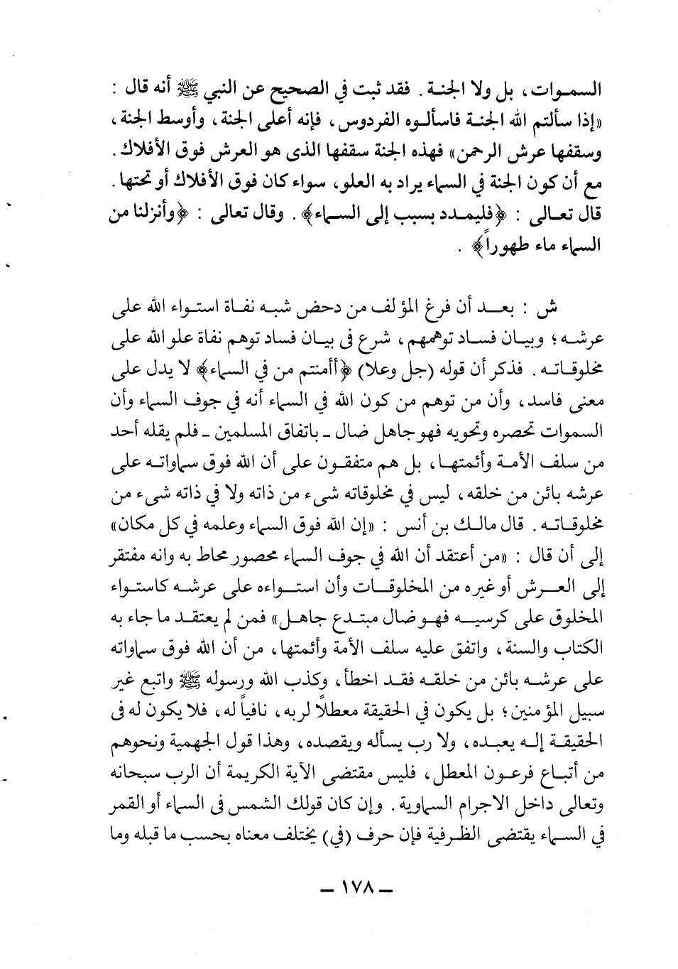 ش: بعد أن فرغ المؤلف من دحض شبه نفاة استواء الله على عرشه، وبيان فساد توهمهم، شرع في بيان فساد توهم نفاة علو الله على مخلوقته. فذكر أن قوله "جل وعلا"} أَأَمِنْتُمْ مَنْ فِي السَّمَاءِ} لا يدل على معنى فاسد، وأن من توهم من كون الله في السناء أنه في جوف السماء وأن السموات تحصره وتحويه فهو جاهل ضال_ باتفاق المسلمين_ فلم يقله أحد من سلف الأمة وأئمتها، بل هم متفقون على أن الله فوق سماواته على عرشه بائن من خلقه، ليس في مخلوقاته شيء من ذاته ولا في ذاته شيء من مخلوقاته. قال مالك بن أنس: "أن الله فوق السماء وعلمه في كل مكان" إلى أن قال: "من أعتقد أن الله في جوف السماء محصور محاط به وأنه مفتقر إلى العرش أو غيره من المخلوقات وأن استواءه على عرشه كاستواء المخلوق على كرسيه فهو ضال مبتدع جاهل" فمن لم يعتقد ما جاء به الكتاب والسنة، واتفق عليه سلف الأمة وأئمتها، من أن الله فوق سماواته على عرشه بائن من خلقه فقد اخطأ، وكذب الله ورسوله صلى الله عليه وسلم واتبع غير سبيل المؤمنين، بل يكون في الحقيقة معطلاً لربه، نافياً له، فلا يكون له في الحقيقة إله يعبده، ولا رب يسأله ويقصده، وهذا قول الجهمية ونحوهم من أتباع فرعون المعطل، فليس مقتضى الآية الكريمة أن الرب سبحانه وتعالى داخل الأجرام السماوية. وأن كان قولك الشمس في السماء أو المر في السماء يقتضي الظرفية فإن حرف "في" معناه بحسب ما قبله وما