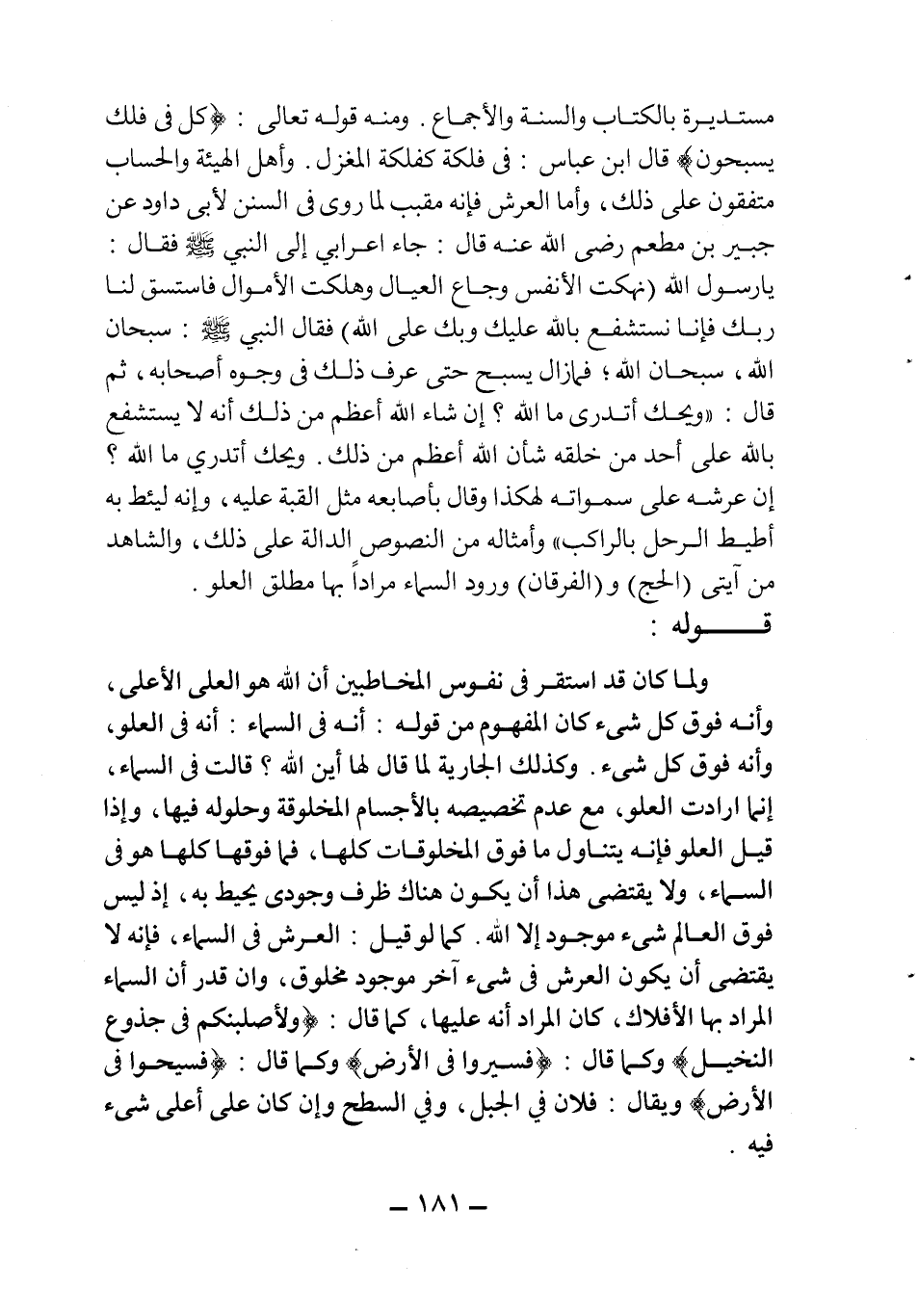 مستديرة في الكتاب والسنة والإجماع. ومنه قوله تعالى: {كُلٌّ فِي فَلَكٍ يَسْبَحُونَ} وقال ابن عباس: في فلكة كفلكة المغزل. وأهل الهيئة والحساب متفقون عل ذلك، وأما العرش فإنه مقبب لما روى في السنن لأبي داوود عن جبير بن مطعم رضي الله عنه قال: جاء أعرابي على النبي صلى الله عليه وسلم فقال: يا رسول الله " نهكت الأنفس وجاع العيال وهلكت الأموال فاستسق لنا ربك فإنا نستشفع بالله عليك وربك على الله" قال النبي صلى الله عليه وسلم: سبحان الله، سبحان الله فما زال يسبح حتى عرف ذلك في وجوه أصحابه، ثم قال: " ويحك أتدري ما الله؟ إن شاء الله أعظم من ذلك أنه لا يستشفع بالله على أحد من خلقه شأن الله أعظم من ذلك. ويحك أتدري ما الله؟ إن عرشه على سماواته لهكذا وقال بأصابعه مثل القبة عليه وأنه ليئط به أطيط الرحل بالراكب" وأمثاله من النصوص الدالة على ذلك والشاهد من آيتي "الحج" و "الفرقان" ورود السماء بها مراداً بها مطلق العلو.