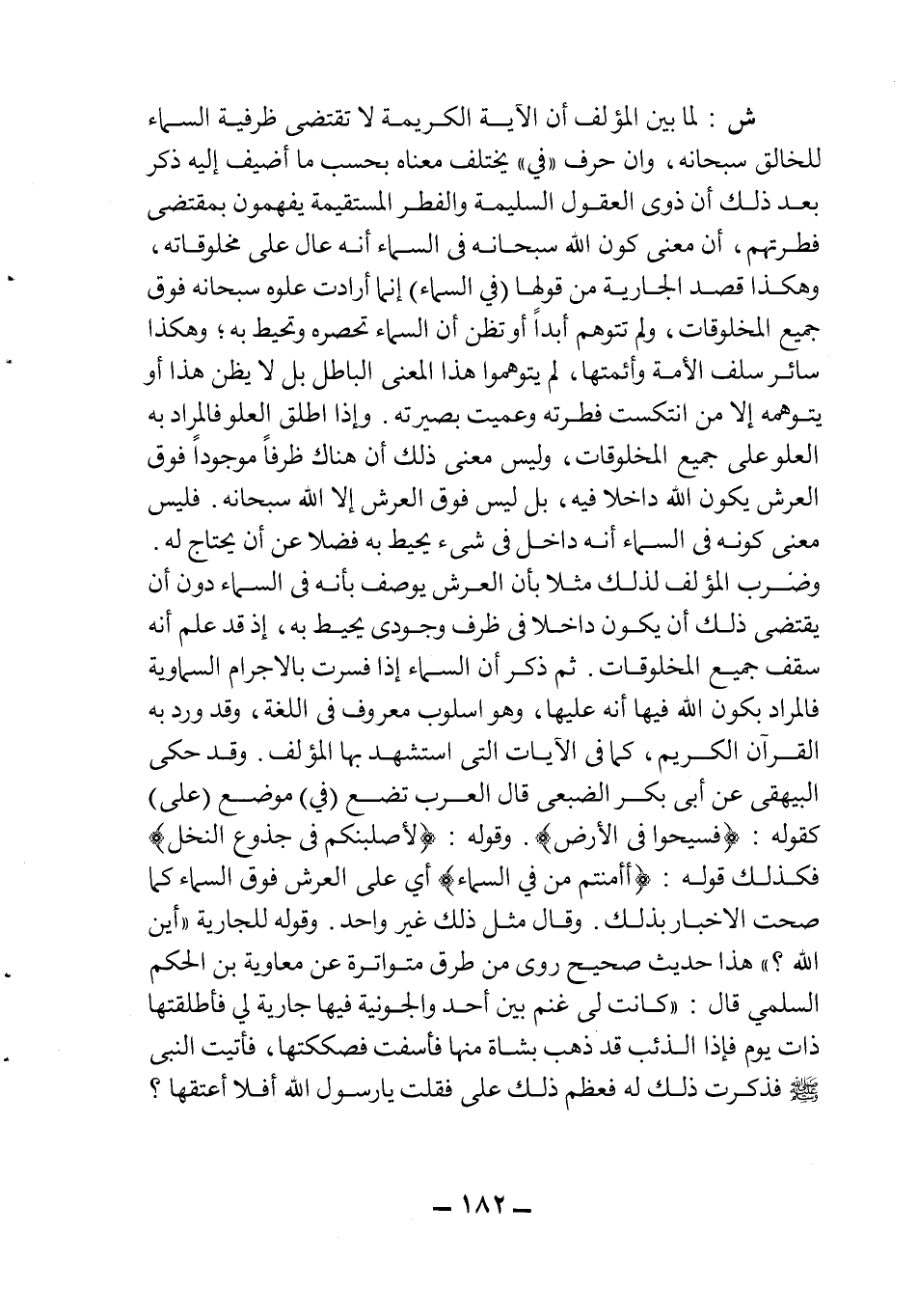 ش: لما بين المؤلف أن الآية الكريمة لا تقتضي ظرفية السماء للخالق سبحانه وأن حرف"في" يختلف معناه بحسب ما أضيف إليه ذكر بعد ذلك أن ذوي العقول السليمة والفطر المستقيمة يفهمون بمقتضى فطرتهم أن معنى كون الله سبحانه في السماء أنه عال على مخلوقاته، وهكذا قصد الجارية من قولها: "في السماء" إنما أرادت علوه سبحانه فوق جميع المخلوقات، ولم تتوهم أبداً أو تظن أن السماء تحصره وتحيط به، وهكذا سائر سلف الأمة وأئمتها، لم يتوهموا هذا المعنى بل لا يظن هذا أو يتوهمه إلا من انتكست فطرته وعميت بصيرته. وإذا أطلق العلو فالمراد به العلو على جميع المخلوقات وليس معنى ذلك أن هناك ظرفا موجودا فوق العرش فليس معنى كونه في السماء أنه داخل في شيء يحيط به فضلا عن أن يحتاج له. وضرب المؤلف لذلك مثلا بأنه العرش يوصف بأنه في السماء دون أن يقتضي ذلك أن يكون داخل في ظرف وجودي يحيط به إذ قد علم أنه سقف جميع المخلوقات. ثم ذكر أن السماء إذا فسرت بالأجرام السماوية فالمراد بكون الله فيها أنه عليها، وهو أسلوب معروف في اللغة، وقد ورد به القرآن الكريم، كما في الآيات التي استشهد فيها المؤلف. وقد حكى البيهقي عن أبي بكر الضبعي قال العرب تضع"في" موضع"على" كقوله {فَسِيحُوا فِي الْأَرْضِ} . وقوله: {وَلَأُصَلِّبَنَّكُمْ فِي جُذُوعِ النَّخْلِ} فكذلك قوله: {أَمِنْتُمْ مَنْ فِي السَّمَاءِ} أي على العرش فوق السماء كما صحت الأخبار بذلك. وقال مثل ذلك غير واحد وقوله للجارية "أين الله؟ " هذا حديث صحيح روى من طرق متواترة على معاوية بن الحكم السلمي قال: "كانت لي غنم بين أحد والجونية فيها جارية لي فأطلقتها ذات يوم فإذا الذئب قد ذهب بشاة منها فأسفت فصككتها، فأتيت النبي صلى الله عليه وسلم فذكرت ذلك له فعظم ذلك على فقلت يا رسول الله أفلا أعتقها؟