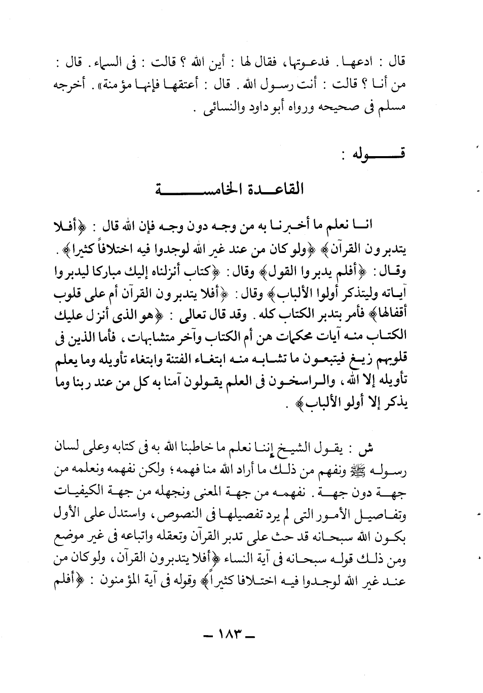 ش: يقول الشيخ أننا نعلم ما خاطبنا الله به في كتابه وعلى لسان رسوله صلى الله عليه وسلم ونفهم من ذلك ما أراد الله من فهمه، ولكن نفهمه ونعلمه من جهة دون جهة. نفهمه من جهة المعنى ونجهله من جهة الكيفيات وتفاصيل الأمور التي لم يرد تفصيلها في النصوص، واستدل على الأول بكون الله سبحانه قد حث على تدبر القرآن وتعقله وإتباعه في غير موضع ومن ذلك قوله سبحانه في آية النساء {أَفَلا يَتَدَبَّرُونَ القرآن وَلَوْ كان مِنْ عِنْدِ غَيْرِ اللَّهِ لَوَجَدُوا فِيهِ اخْتِلافاً كَثِيراً} وقوله في آية المؤمنون: {أَفَلَمْ