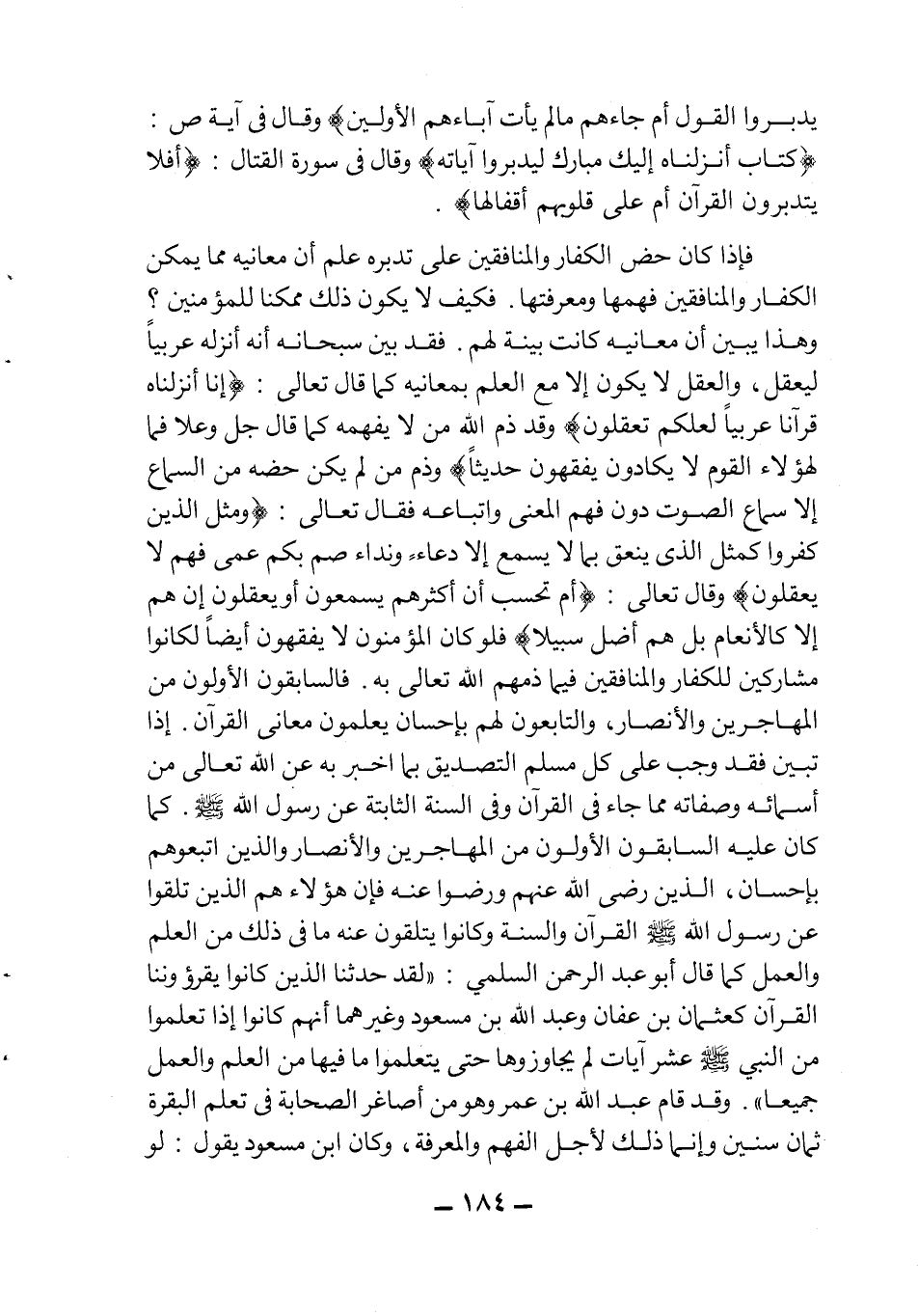 فإذا كان حض الكفار والمنافقين على تدبره علم أن معانيه مما يمكن الكفار والمنافقين فهمها ومعرفتها. فكيف لا يكون ذلك ممكناً للمؤمنين؟ وهذا يبين أن معانيه كانت بينة لهم. فقد بين سبحانه أنه أنزله عربيا ليعقل، والعقل لا يكون إلا مع العلم بمعانيه كما قال تعالى {أنا أنزَلْنَاهُ قُرْأناً عَرَبِيا لَعَلَّكُمْ تَعْقِلُونَ} وقد ذم الله من لا يفهمه كما قال جل وعلا {فَمَالِ هَؤُلاءِ الْقَوْمِ لا يَكَادُونَ يَفْقَهُونَ حَدِيثاً} وذم من لم يكن حظه من السماع إلا سماع الصوت دون فهم المعنى وإتباعه فقال تعالى: {وَمَثَلُ الَّذِينَ كَفَرُوا كَمَثَلِ الَّذِي يَنْعِقُ بِمَا لا يَسْمَعُ إِلَّا دُعَاءً وَنِدَاءً صُمٌّ بُكْمٌ عُمْيٌ فَهُمْ لا يَعْقِلُونَ} وقال تعالى: {أَمْ تَحْسَبُ أن أَكْثَرَهُمْ يَسْمَعُونَ أو يَعْقِلُونَ أن هُمْ إِلَّا كَالْأنعَامِ بَلْ هُمْ أَضَلُّ سَبِيلاً} فلو كان المؤمنون لا يفقهون أيضاً لكانوا مشاركين للكفار والمنافقين فيما ذمهم الله تعالى به. فالسابقون الأولون من المهاجرين والأنصار، والتابعون لهم بإحسان يعلمون معاني القرآن. إذا تبين فقد وجب على كل مسلم التصديق بما أخبر به عن الله تعالى من أسمائه وصفاته مما جاء في القرآن وفي السنة الثابتة عن رسول الله صلى الله عليه وسلم. كما كان عليه السابقون الأولون من المهاجرين والأنصار والذين اتبعوهم بإحسان، الذين رضي الله عنهم ورضوا عنه فإن هؤلاء هم الذين تلقوا عن رسول الله صلى الله عليه وسلم القرآن والسنة وكانوا يتلقون عنه ما في ذلك من العلم والعمل كما قال أبو عبد الرحمن السلمي: "لقد حدثنا الذين كانوا يقرؤوننا القرآن كعثمان بن عفان وعبد الله بن مسعود وغيرهما أنهم كانوا إذا تعلموا من النبي صلى الله عليه وسلم عشر آيات لم يجاوزوها حتى يتعلموا ما فيها من العلم والعمل جميعاً" وقد قام عبد الله بن عمر وهو من أصاغر الصحابة في تعلم البقرة ثمان سنين وإنما ذلك لأجل الفهم والمعرفة، وكان ابن مسعود يقول: لو