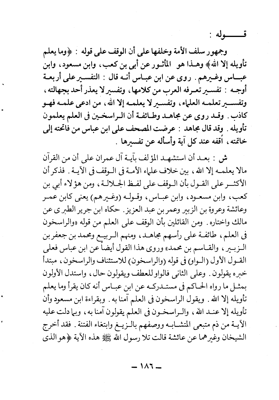 وجمهور سلف الأمة وخلفها على أن الوقف على قوله: {وَمَا يَعْلَمُ تأويلهُ إِلَّا اللَّهُ} وهذا هو المأثور عن أبي بن كعب، وابن مسعود، وابن عباس وغيرهم. روي عن ابن عباس أنه قال: التفسير على أربعة أوجه: تفسير تعرفه العرب من كلامها، وتفسير لا يعذر أحد بجهالته، وتفسير تعلمه العلماء، وتفسير لا يعلمه إلا الله، من ادعى علمه فهو كاذب. وقد روي عن مجاهد وطائفة أن الراسخين في العلم يعلمون تأويله. وقد قال مجاهد: عرضت المصحف على ابن عباس من فاتحته إلى خاتمته، أقفه عند كل آية وأسأله عن تفسيرها.