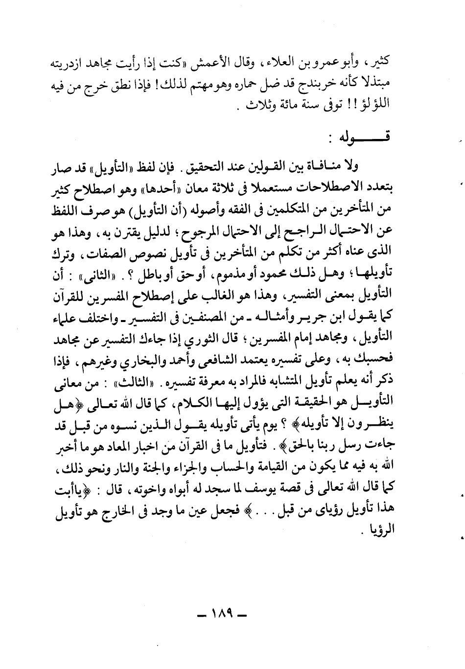 ولا منافاة بين القولين عند التحقيق. فإن لفظ "التأويل" قد صار بتعدد الاصطلاحات مستعملاً في ثلاثة معان "أحدها" وهو اصطلاح كثير من المتأخرين من المتكلمين في الفقه وأصوله "أن التأويل" هو صرف اللفظ عن الاحتمال الراجح إلى الاحتمال المرجوح، لدليل يقترن به، وهذا هو الذي عناه أكثر من تكلم من المتأخرين في تأويل نصوص الصفات، وترك تأويلها، وهل ذلك من محمود أو مذموم، أو حق أو باطل؟. "الثاني": أن التأويل بمعنى التفسير، وهذا هو الغالب على اصطلاح المفسرين للقرآن كما يقول ابن جرير وأمثاله من المصنفين في التفسير واختلف علماء التأويل، ومجاهد أمام المفسرين، قال الثوري: إذا جاءك التفسير عن مجاهد فحسبك به، وعلى تفسيره يعتمد الشافعي وأحمد والبخاري وغيرهم، فإذا ذكر أنه يعلم تأويل المتشابه فالمراد به معرفة تفسيره. "الثالث": من معاني التأويل هو الحقيقة التي يؤول إليها الكلام، كما قال الله تعالى: {هَلْ يَنْظُرُونَ إِلَّا تَأْوِيلَهُ يَوْمَ يَأتِي تَأْوِيلُهُ يَقُولُ الَّذِينَ نَسُوهُ مِنْ قَبْلُ قَدْ جَاءَتْ رُسُلُ رَبِّنَا بِالْحَقِّ} . فتأويل ما في القرآن من أخبار المعاد هو ما أخبر الله به فيه مما يكون من القيامة والحساب والجزاء والجنة والنار ونحو ذلك، كما قال الله تعالى في قصة يوسف لما سجد له أبواه وإخوته، قال: {يا أَبَتِ هَذَا تأويل رُؤْياي مِنْ قَبْلُ ... } فجعل عين ما وجد في الخارج هو تأويل الرؤيا.