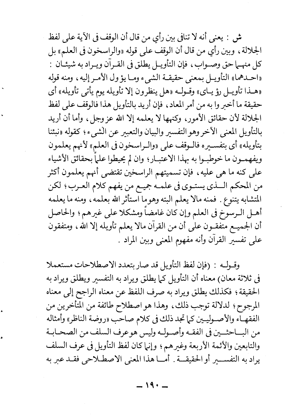 ش: يعني أنه لا تنافي بين رأي من قال أن الوقف في الآية على لفظ الجلالة، وبين رأي من قال أن الوقف على قوله "والراسخون في العلم" بل كل منهما حق وصواب، فإن التأويل يطلق في القرآن ويراد به شيئان: "أحدهما" التأويل بمعنى حقيقة الشيء وما يؤول الأمر إليه، ومنه قوله: {هَذَا تَأْوِيلُ رُؤْيايَ} وقوله: {هَلْ يَنْظُرُونَ إِلَّا تَأْوِيلَهُ يَوْمَ يَأتِي تَأْوِيلُهُ} أي حقيقة ما أخبروا به من أمر المعاد، فإن أريد بالتأويل هذا فالوقف على لفظ الجلالة لأن حقائق الأمور، وكنهها لا يعلمه إلا الله عز وجل، وأما أن أريد بالتأويل المعنى الآخر وهو التفسير والبيان والتعبير عن الشيء، كقوله: {نَبِّئْنَا بِتَأْوِيلِهِ} أي بتفسيره فالوقف على {وَالرَّاسِخُونَ فِي الْعِلْمِ} لأنهم يعلمون ويفهمون ما خوطبوا به بهذا الاعتبار، وأن يحيطوا علماً بحقائق الأشياء على كنه ما هي عليه، فإن تسميتهم الراسخين تقتضي أنهم يعلمون أكثر من المحكم الذي يستوي في علمه جميع من يفهم كلام العرب، لكن المتشابه يتنوع. فمنه مالا يعلم البتة وهو ما استأثر الله بعلمه، ومنه ما يعلمه أهل الرسوخ في العلم وأن كان غامضاً ومشكلاً على غيرهم، والحاصل أن الجميع متفقون على أن من القرآن ما لا يعلم تأويله إلا الله، ومتفقون على تفسير القرآن وأنه مفهوم المعنى وبين المراد.