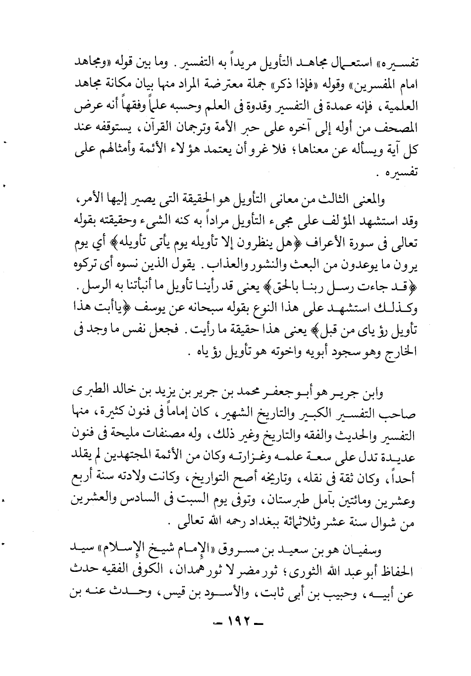 تفسيره" استعمال مجاهد التأويل مريداً به التفسير. وما بين قوله "ومجاهد أمام المفسرين" وقوله "فإذا ذكر" جملة معترضة المراد منها بيان مكانة مجاهد العلمية، فإنه عمدة في التفسير وقدوة في العلم وحسبه علماً وفقهاً أنه عرض المصحف من أوله إلى آخره على حبر الأمة وترجمان القرآن، يستوقفه عند كل آية ويسأله عن معناها، فلا غرو أن يعتمد هؤلاء الأئمة وأمثالهم على تفسيره.