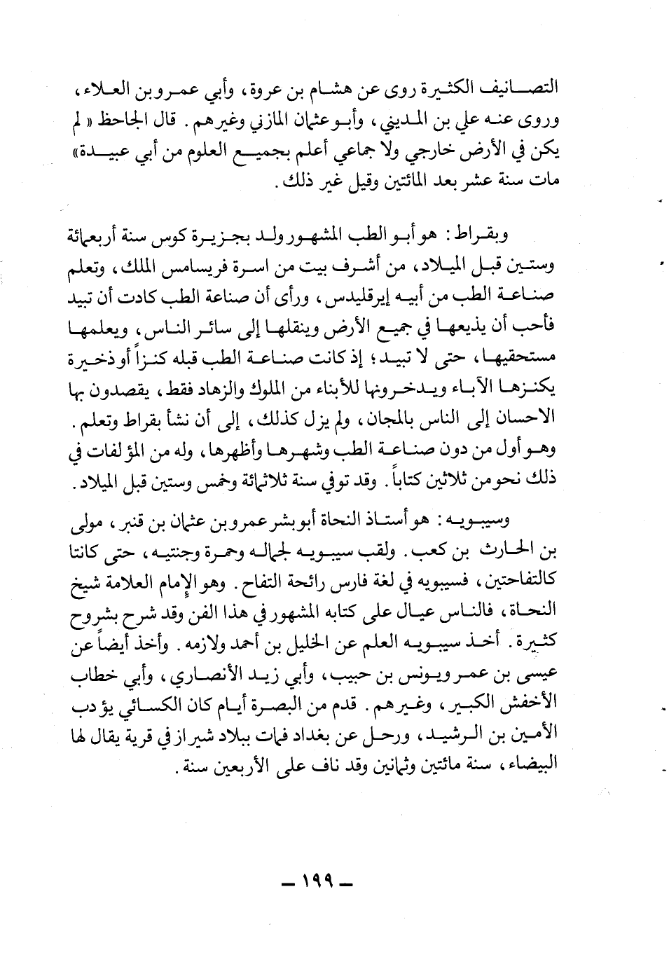 وسيبويه: هو أستاذ النحاة أبو بشر عمرو بن عثمان بن قنبر، مولى بن الحارث بن كعب. ولقب سيبويه لجماله وحمرة وجنتيه، حتى كانتا كالتفاحتين، فسيبويه في لغة فارس رائحة التفاح. وهو الإمام العلامة شيخ النحاة، فالناس عيال على كتابه المشهور في هذا الفن وقد شرح بشروح كثيرة. أخذ سيبويه العلم عن الخليل بن أحمد ولازمه. وأخذ أيضاً عن عيسى بن عمر ويونس بن حبيب، وأبي زيد الأنصاري، وأبي خطاب الأخفش الكبير، وغيرهم. قدم من البصرة أيام كان الكسائي يؤدب الأمين بن الرشيد، ورحل عن بغداد فمات ببلاد شيراز في قرية يقال لها البيضاء، سنة مائتين وثمانين وقد ناف على الأربعين سنة.