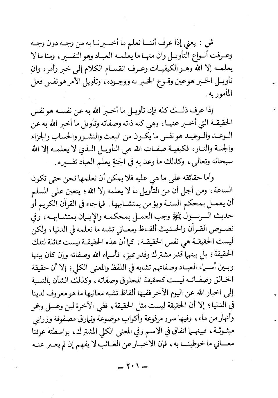 وأما حقائقه على ما هي عليه فلا يمكن أن نعلمها نحن حتى تكون الساعة، ومن أجل أن من التأويل مالا يعلمه إلا الله، يتعين على المسلم أن يعمل بمحكم السنة ويؤمن بمتشابهها. فما جاء في القرآن الكريم أو حديث الرسول صلى الله عليه وسلم وجب العمل بمحكمه والإيمان بمتشابهه، وفي نصوص القرآن والحديث ألفاظ ومعاني تشبه ما نعلمه في الدنيا، ولكن ليست الحقيقة هي نفس الحقيقة، كما أن هذه الحقيقة ليست مماثلة لتلك الحقيقة، بل بينهما قدر مشترك وقدر مميز، فأسماء الله وصفاته وأن كان بينها وبين أسماء العباد وصفاتهم تشابه في اللفظ والمعنى الكلي، إلا أن حقيقة الخالق وصفاته ليست كحقيقة المخلوق وصفاته، وكذلك الشأن بالنسبة إلى إخبار الله عن اليوم الآخر ففيها ألفاظ تشبه معانيها ما هو معروف لدينا في الدنيا، إلا أن الحقيقة ليست مثل الحقيقة، ففي الآخرة لبن وعسل وخمر وأنهار من ماء، وفيها سرر مرفوعة وأكواب موضوعة ونمارق مصفوفة وزرابي مبثوثة، فبينهما اتفاق في الاسم وفي المعنى الكلي المشترك، بواسطته عرفنا معاني ما خوطبنا به، فإن الإخبار عن الغائب لا يفهم أن لم يعبر عنه