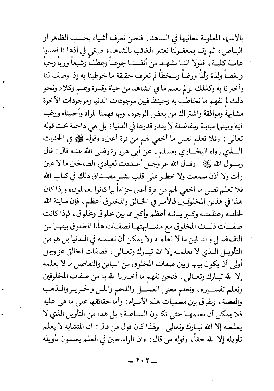 بالأسماء المعلومة معانيها في الشاهد، فنحن نعرف أشياء بحسب الظاهر أو الباطن، ثم إنا بمعقولنا نعتبر الغائب بالشاهد، فيبقى في أذهاننا قضايا عامة كلية، فلولا أننا نشهد من أنفسنا جوعاً وعطشاً وشبعاً وريا وحباً وبغضاً ولذةً ورضاً وسخطاً لم نعرف حقيقة ما خوطبنا به إذا وصف لنا وأخبرنا به وكذلك لو لم نعلم ما في الشاهد من حياة وقدرة وعلم وكلام ونحو ذلك لم نفهم ما نخاطب به وحينئذ فبين موجودات الدنيا وموجودات الآخرة مشابهة وموافقة واشتراك من بعض الوجوه، وبها فهمنا المراد وأحببناه ورغبنا فيه وبينهما مباينة ومفاضلة لا يقدر قدرها في الدنيا، بل هي داخلة تحت قوله تعالى: {فَلا تَعْلَمُ نَفْسٌ مَا أُخْفِيَ لَهُمْ مِنْ قُرَّةِ أَعْيُنٍ} وقوله صلى الله عليه وسلم في الحديث الذي رواه البخاري ومسلم. عن أبي هريرة رضي الله عنه قال: قال رسول الله صلى الله عليه وسلم: "قال الله عز وجل أعددت لعبادي الصالحين مالا عين رأت ولا أذن سمعت ولا خطر على قلب بشر مصداق ذلك في كتاب الله فلا تعلم نفس ما أخفي لهم من قرة أعين جزاءاً بما كانوا يعملون" وإذا كان هذا في هذين المخلوقين فالأمر في الخالق والمخلوق أعظم، فإن مباينة الله لخلقه وعظمته وكبريائه أعظم وأكبر مما بين مخلوق ومخلوق، فإذا كانت صفات ذلك المخلوق مع مشابهتها لصفات هذا المخلوق بينهما من التفاضل والتباين مالا نعلمه ولا يمكن أن نعلمه في الدنيا بل هو من التأويل الذي لا يعلمه إلا الله تبارك وتعالى، فصفات الخالق عز وجل أولى أن يكون بينها وبين صفات المخلوق من التباين والتفاضل مالا يعلمه إلا الله تبارك وتعالى. فنحن نفهم ما أخبرنا الله به من صفات المخلوقين ونعلم تفسيره، ونعلم معنى العسل واللحم واللبن والحرير والذهب والفضة ونفرق بين مسميات هذه الأسماء: وما حقائقها على ما هي عليه فلا يمكن أن نعلمها حتى تكون الساعة، بل هذا من التأويل الذي لا يعلمه إلا الله تبارك وتعالى، ولهذا كان قول من قال: أن المتشابه لا يعلم تأويله إلا الله حقاً، وقول من قال "أن الراسخين في العلم يعلمون تأويله