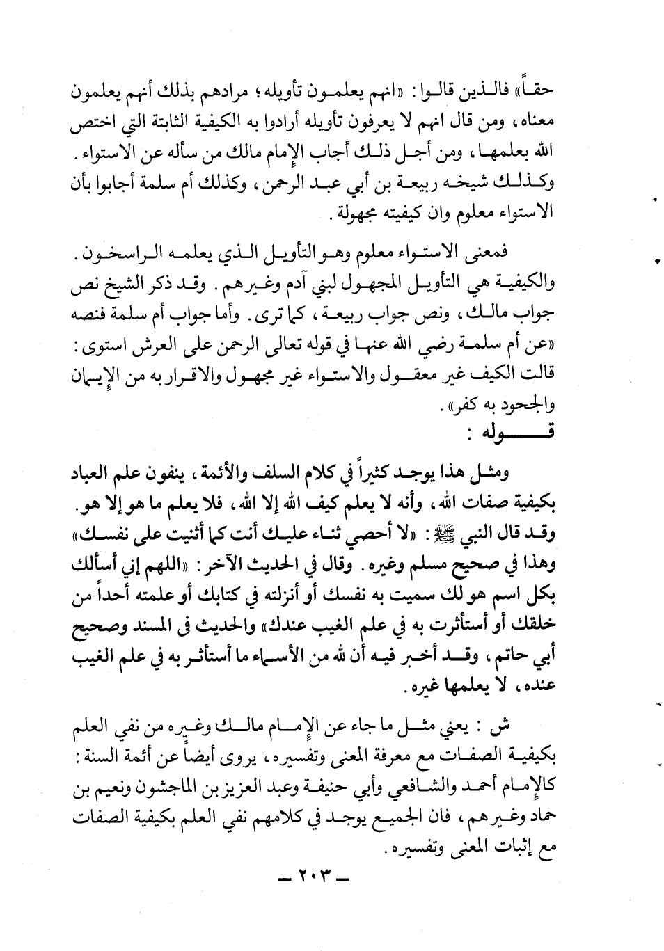 ش: يعني مثل ما جاء عن الإمام مالك وغيره من نفي العلم بكيفية الصفات مع معرفة المعنى وتفسيره، يروى أيضاً عن أئمة السنة: كالإمام أحمد والشافعي وأبي حنيفة وعبد العزيز بن الماجشون ونعيم بن حماد وغيرهم، فإن الجميع يوجد في كلامهم نفي العلم بكيفية الصفات مع إثبات المعنى وتفسيره.