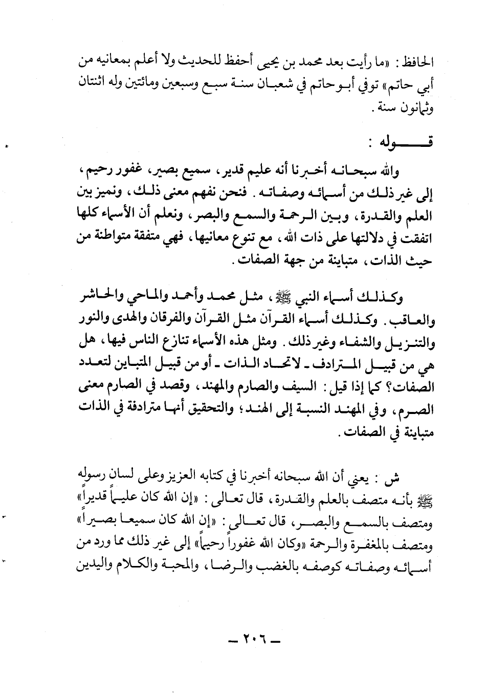 وكذلك أسماء النبي صلى الله عليه وسلم مثل محمد وأحمد والماحي والحاشر والعاقب. وكذلك أسماء القرآن مثل القرآن والفرقان والهدى والنور والتنزيل والشفاء وغير ذلك. ومثل هذه الأسماء تتنازع الناس فيها، هل هي من قبيل المترادف – لإتحاد الذات – أو من قبيل المتباين لتعدد الصفات؟ كما إذا قيل: السيف والصارم والمهند، والقصد في الصارم معنى الصرم، زفي المهند النسبة إلى الهند، والتحقيق أنها مترادفة في الذات متباينة في الصفات.
